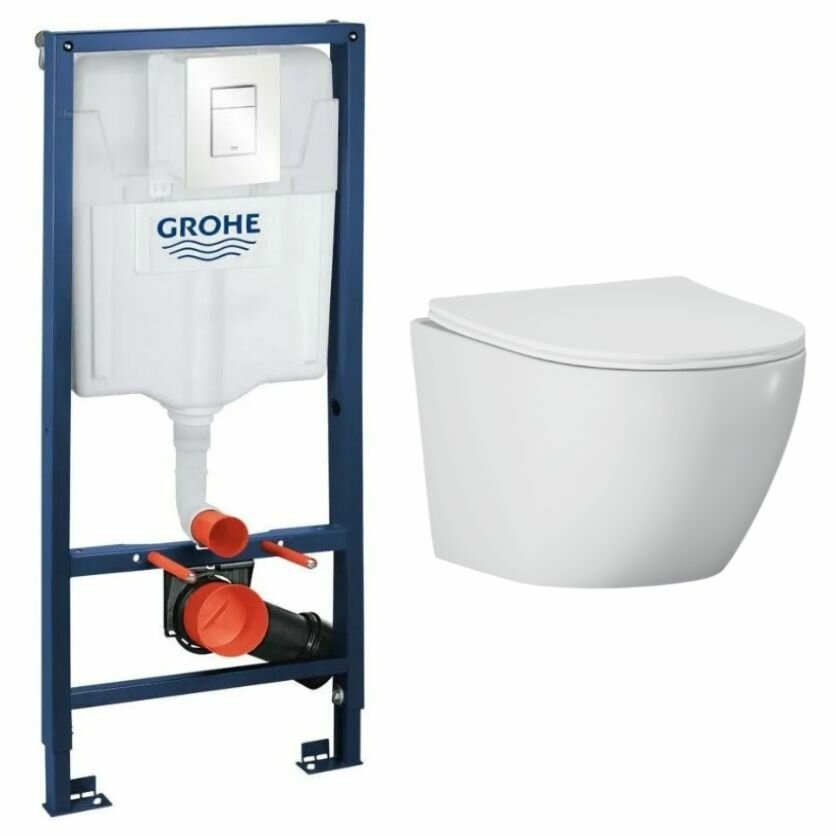 Инсталляция с унитазом Helmken 35103001 комплект 5 в 1: унитаз подвесной безободковый, инсталляция Grohe, прямоугольная белая кнопка, шумоизоляция, сиденье микролифт