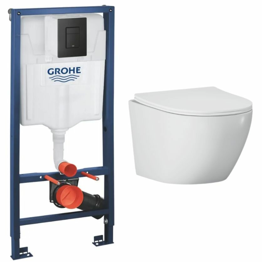 Инсталляция с унитазом Helmken 35103001 комплект 4 в 1: унитаз подвесной безободковый, инсталляция Grohe, овальная черная кнопка смыва, сиденье микролифт