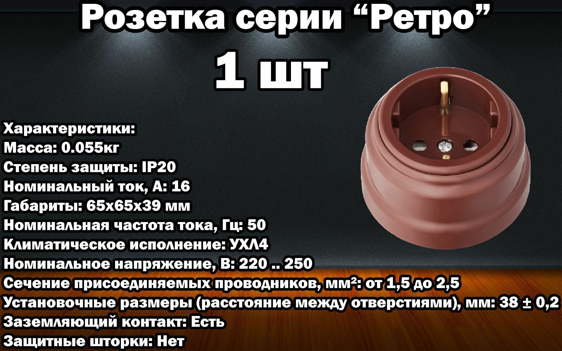Ретро розетка Bylectrica с заземляющим контактом, пластик, цвет коричневый (РА16-0202)