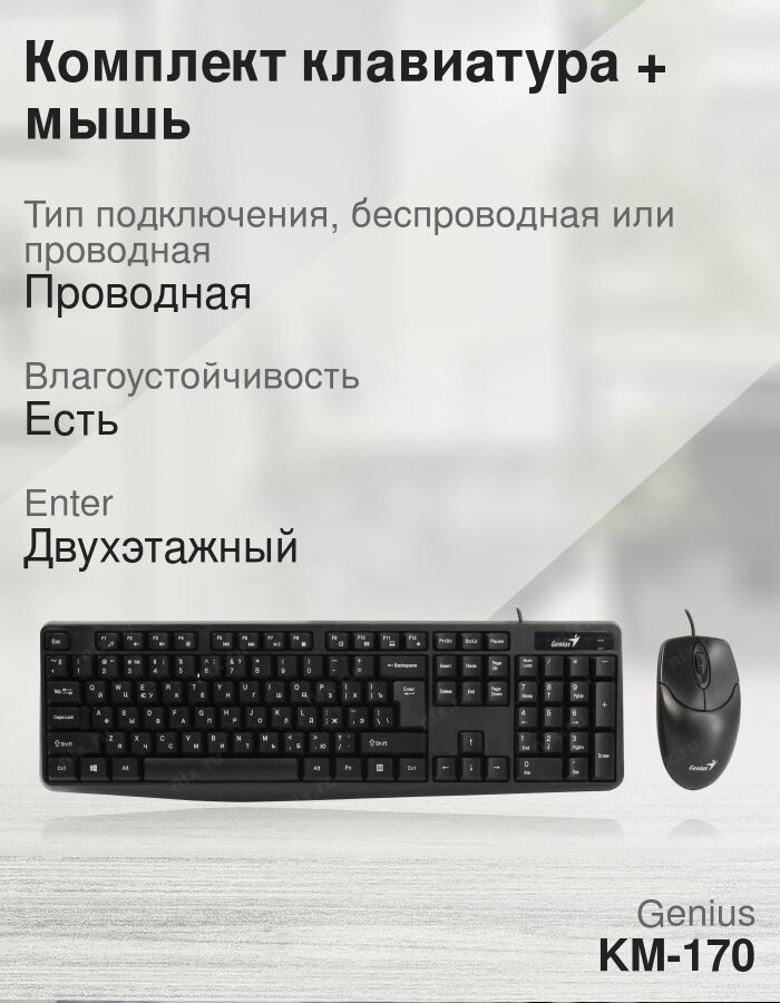 Клавиатура + мышь Genius КМ-170 {Черный, USB,104 кл+ кнопка SmartGenius, мембранная, защита от проливаний,1000 DPI} [31330006403]