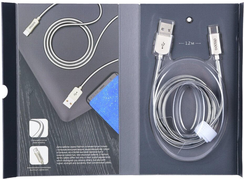 Кабель Deppa Steel USB - USB Type-C, стальной (RU)