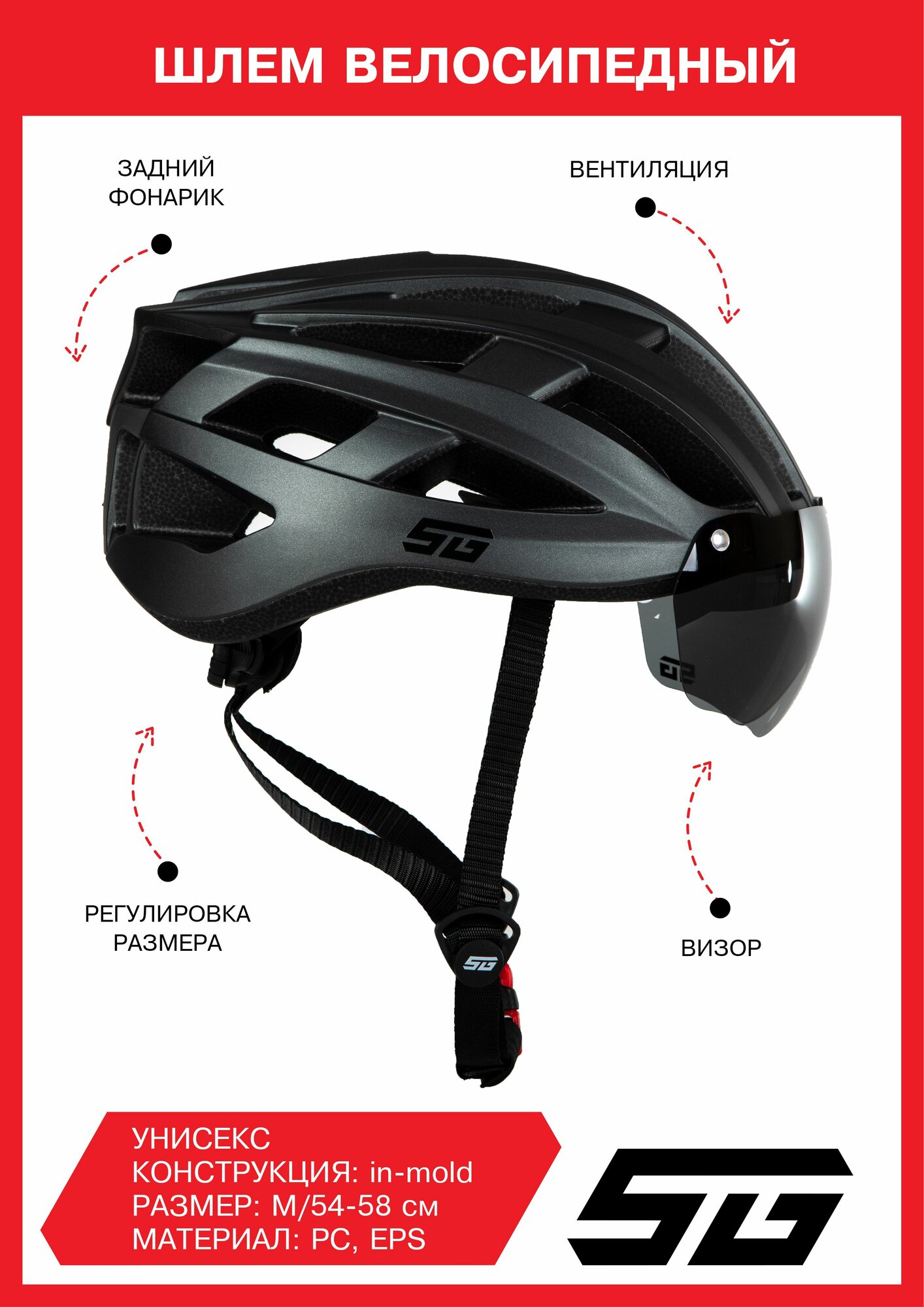 СохранитьВелошлем STG TS-33 с визором и фонарем, M (54-58 см), серый, в коробке интересное: