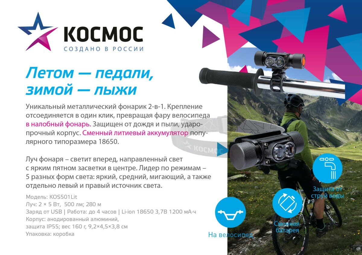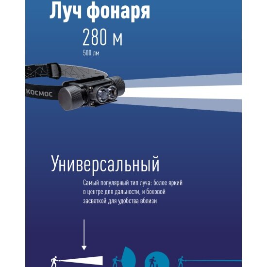 Фонарь аккумуляторный налобный/велосипедный космос KOS 501 Lit 584452