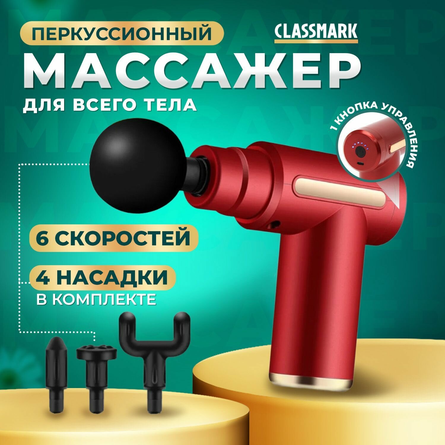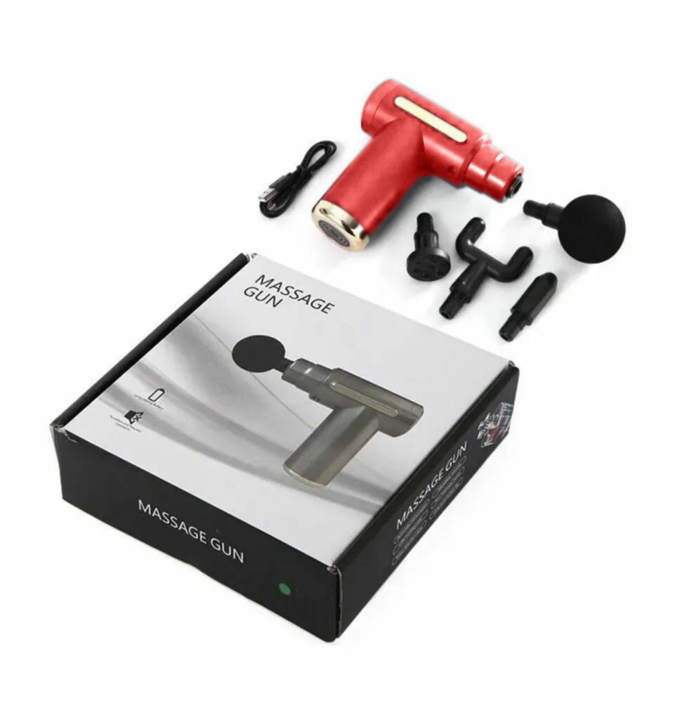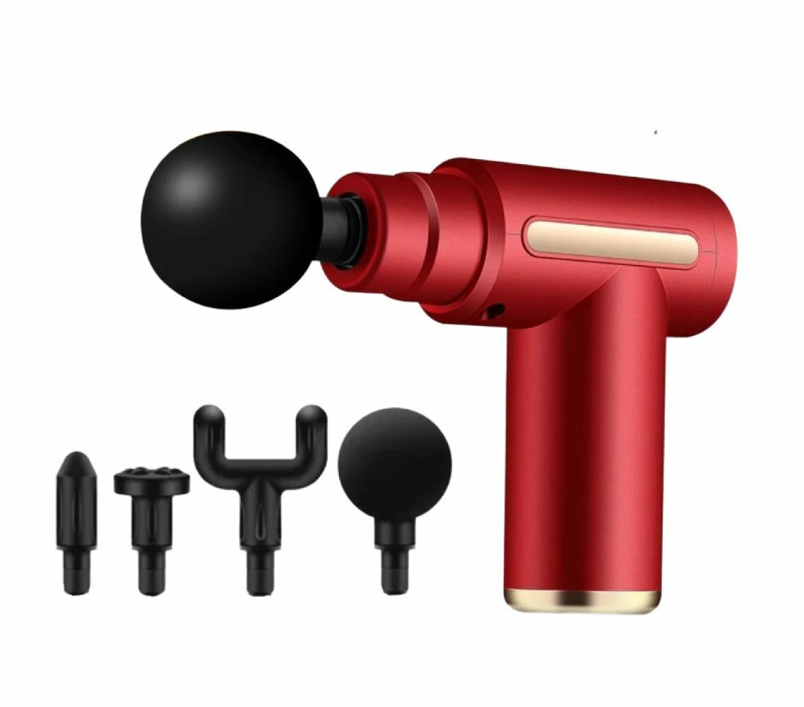 Купить Перкуссионный массажер для тела Classmark беспроводной массажный пистолет электрический для ног, рук, шеи и спины, 4 насадки на все группы мышц, 6 режимов работы, разъем usb type - C, красный