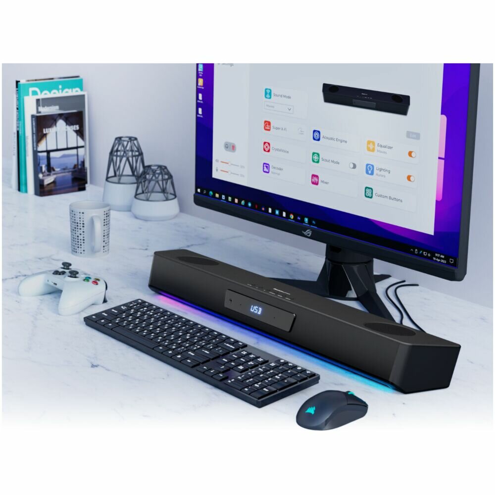 | Дополнительная информация | Особенности: многоканальный игровой саундбар с двойным усилением и технологией Super X-Fi; впечатляющий звук благодаря виртуальному объемному звучанию 5.1; игровые звуковые режимы: SXFI Battle Mode, Scout Mode; настройка персонализированной RGB-подсветки; конструкция двойного усилителя; варианты подключения: USB, HDMI ARC, Bluetooth 5.0; разъем для наушников. |
