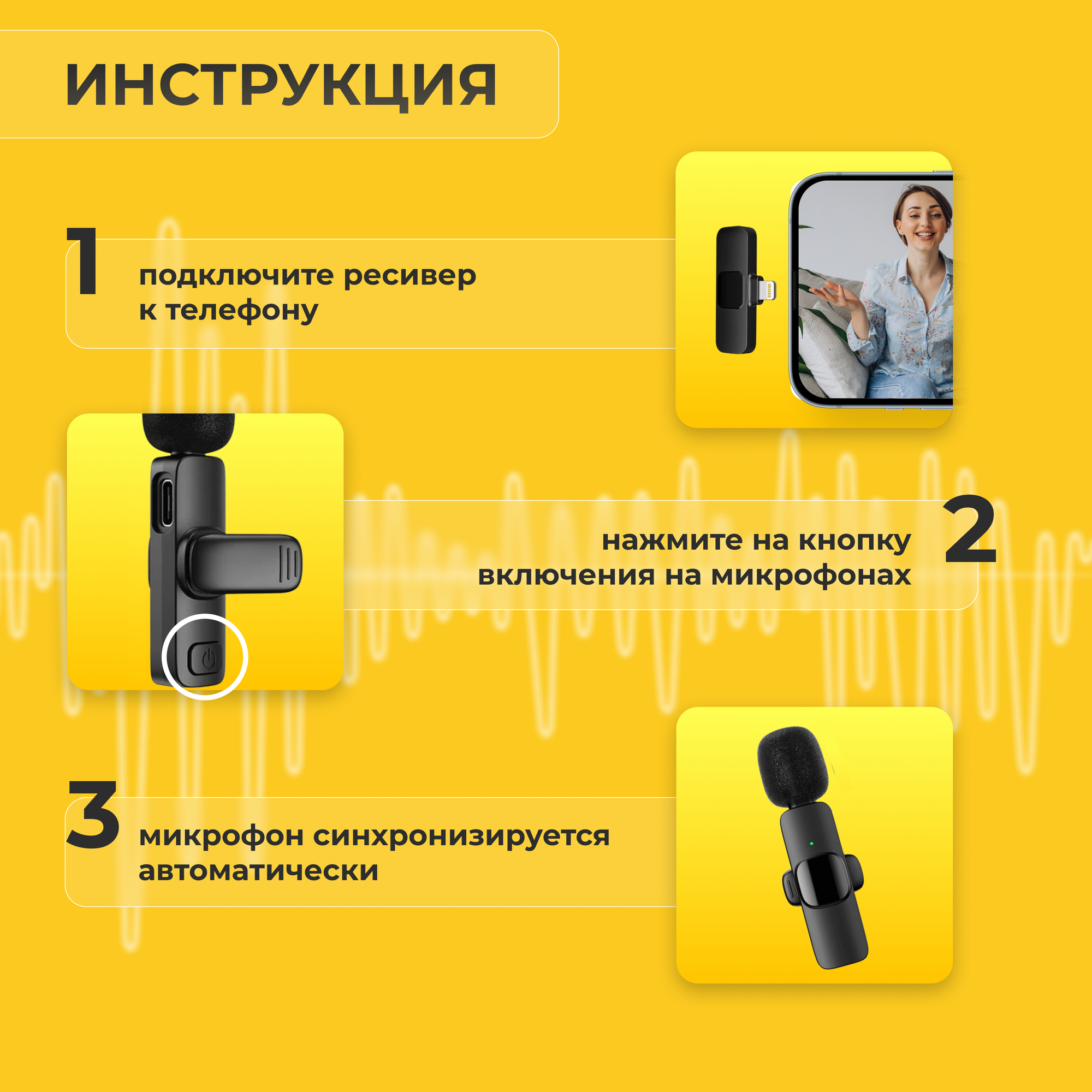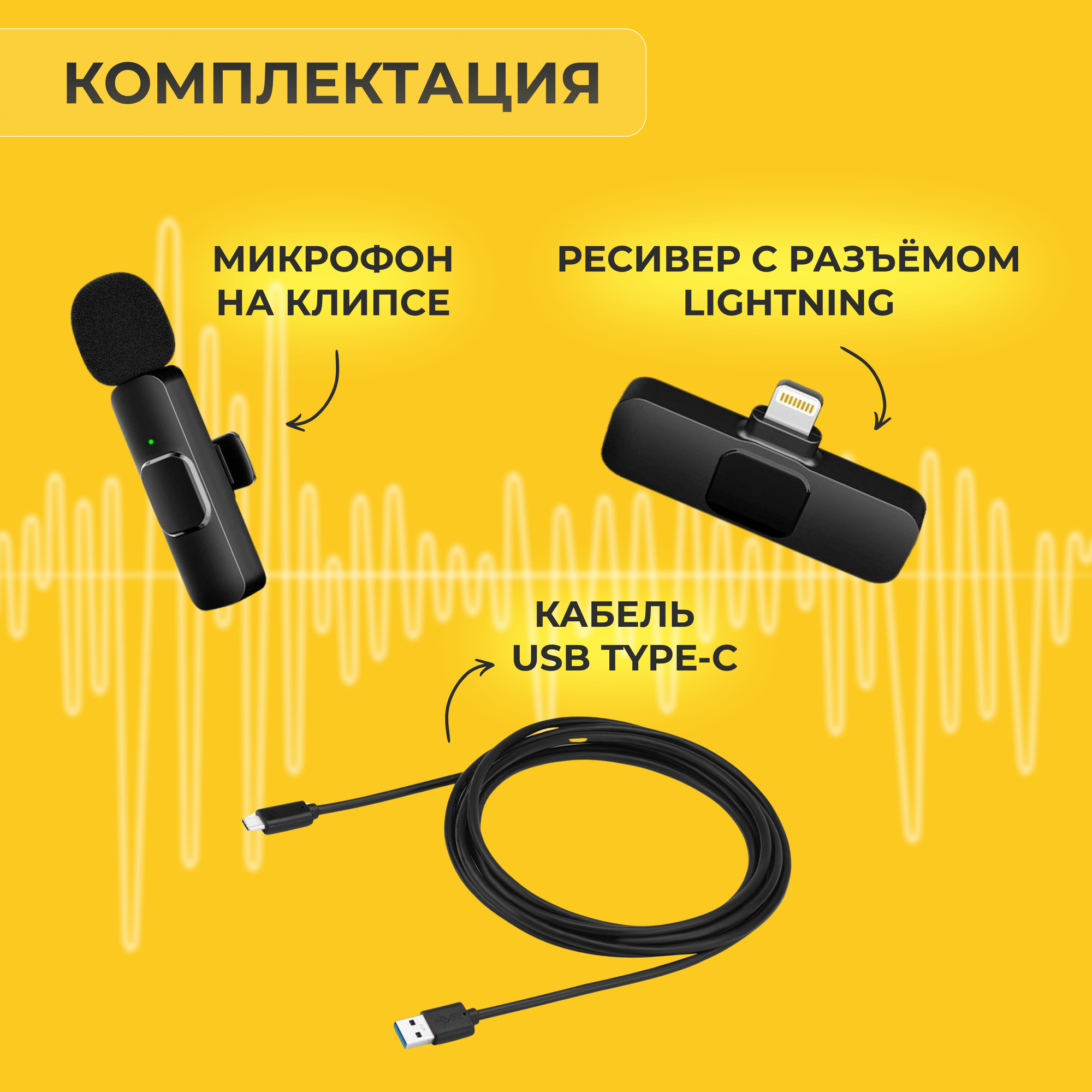 Микрофон петличный беспроводной, с шумоподавлением, петличка, для мобильного телефона, разъем Lightning, для Iphone, черный, 2шт