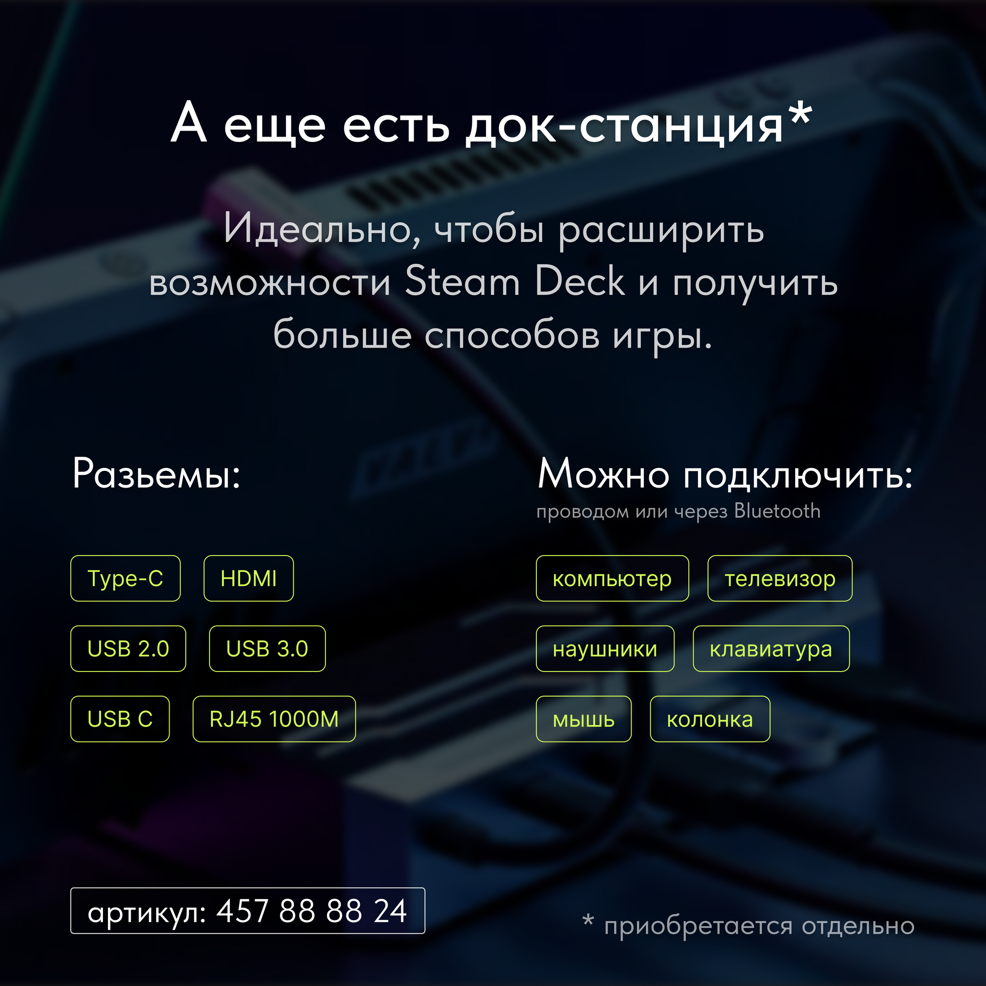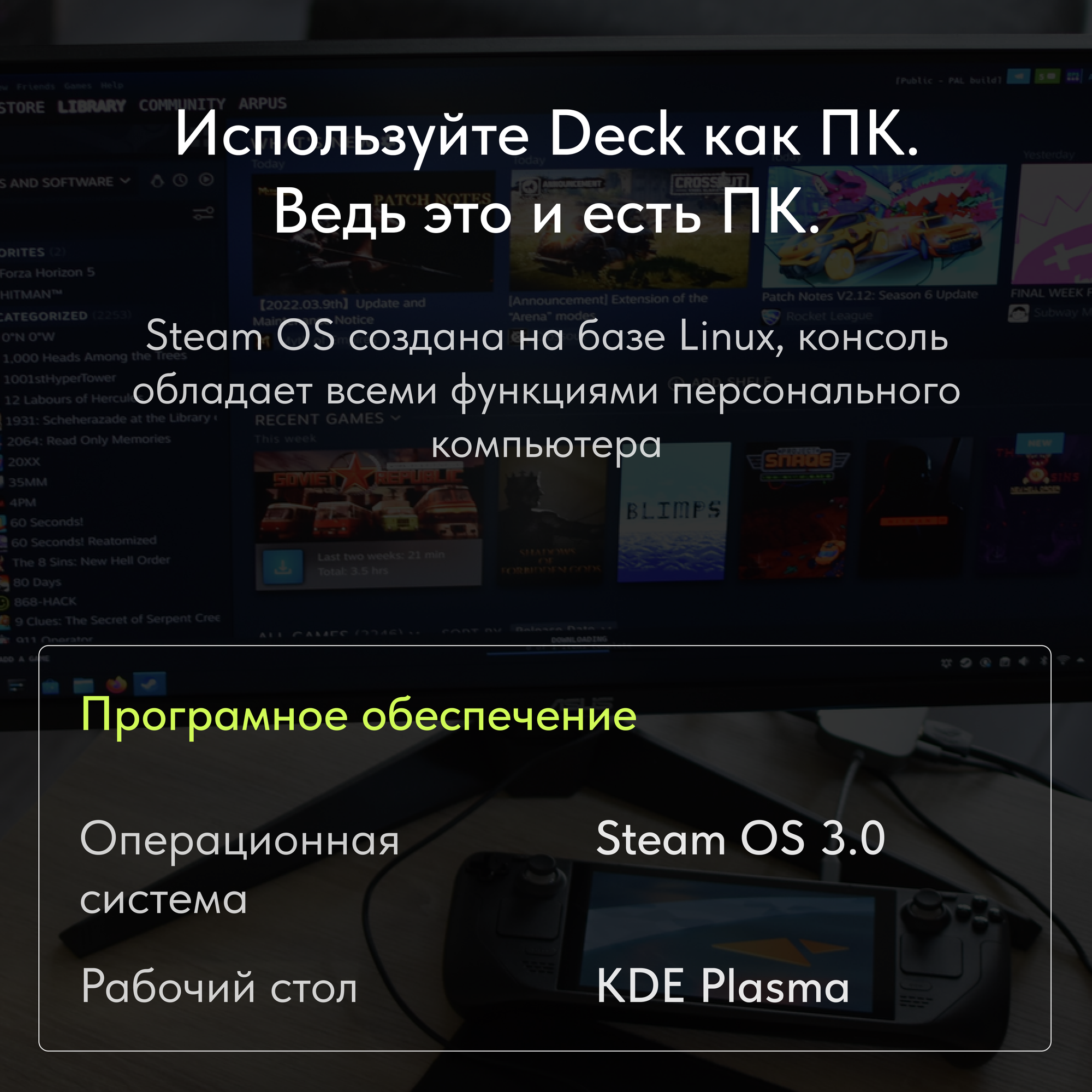 | Дополнительная информация | ЦП: Zen 2 4c/8t, 2,4–3,5 ГГц (до 448 гигафлопс FP32); графический процессор: RDNA 2 с восьмью вычислительными блоками, 1,0 ГГц–1,6 ГГц (до 1,6 терафлопс FP32); мощность APU: 4–15 Вт; 16 ГБ LPDDR5 встроенной оперативной памяти (5500 МТ/с, четыре 32-разрядных канала); USB-C с поддержкой альтернативного режима DisplayPort 1.4; до 8K при 60 Гц или 4K при 120 Гц, USB 3.2 Gen 2; операционная система: SteamOS 3.0 (основана на Arch Linux); док-станция приобретается отдельно |