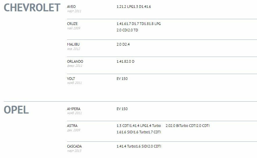 | Модель автомобиля | Chevrolet Aveo / Chevrolet Cobalt / Chevrolet Cruze / Opel Astra / Opel Astra J / Opel Insignia / Opel Mokka / Opel Zafira |
