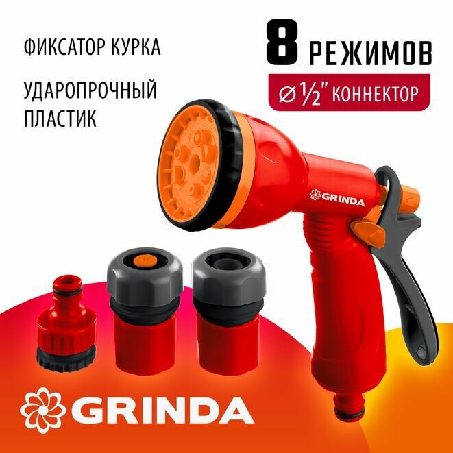 GRINDA GS-12, пистолет с 8 режимами, комплект соединительной арматуры 1/2″, ударопрочный пластик, поливочный набор (8-427383)