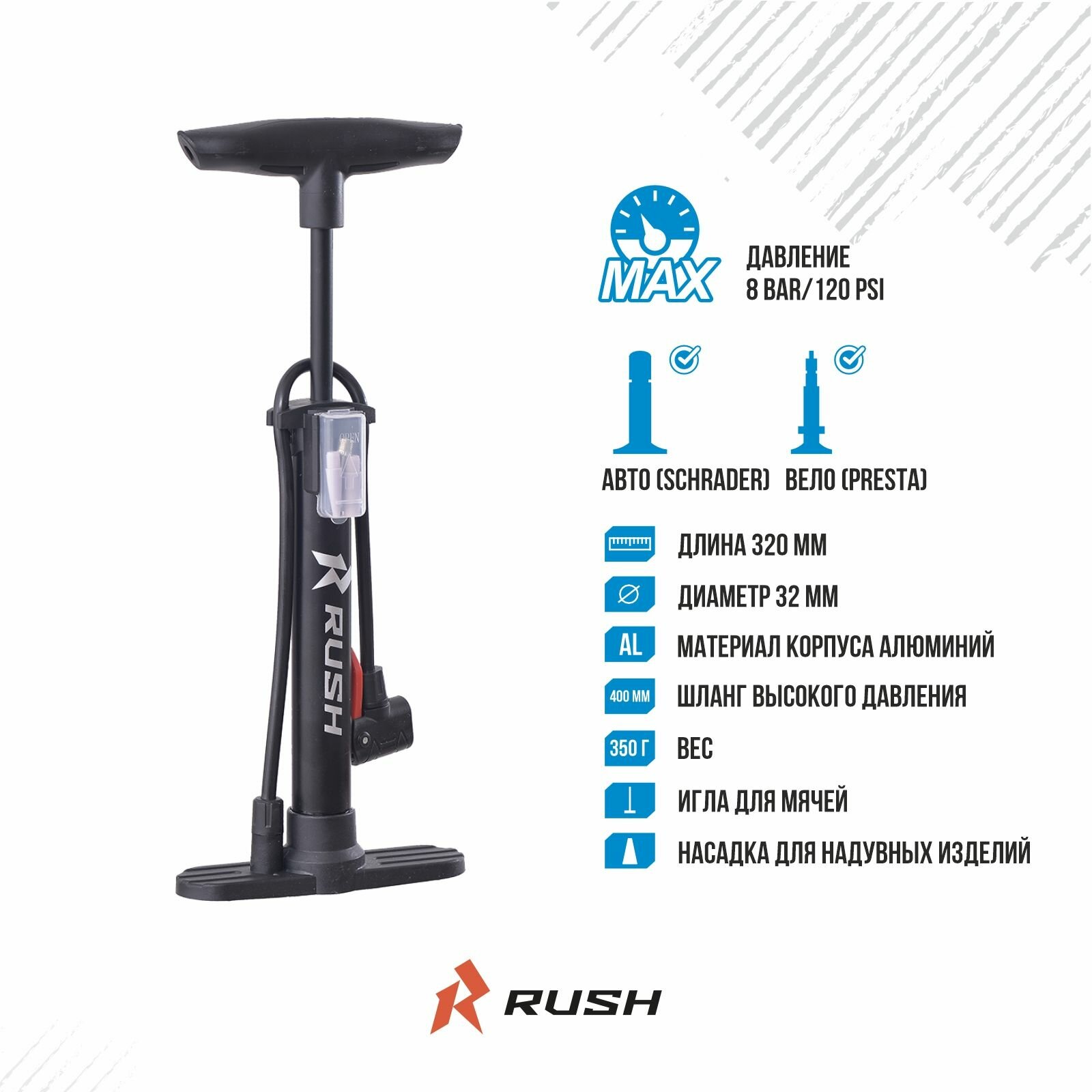 Насос ручной стальной велосипедный с T-ручка 32x320мм RUSH HOUR. Шланг велонасоса под ниппель AV/FV