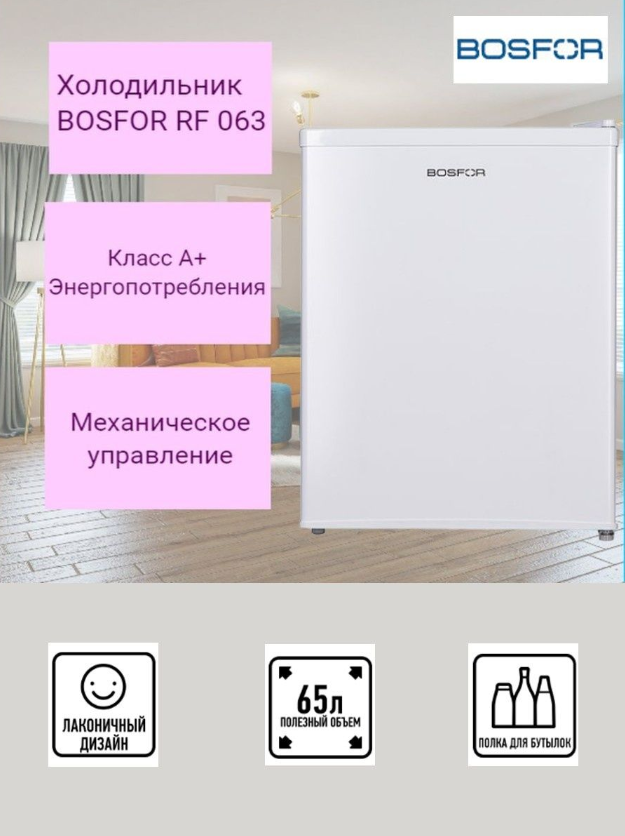 Холодильник мини mini однокамерный Bosfor RF 063. Хладагент: R600a. Общий объем: 67 л. Общий полезный объем: 65 л. Белый. Расположение морозильной камеры: сверху (OL).