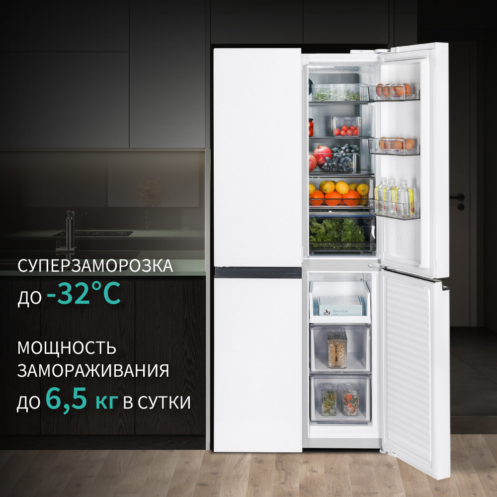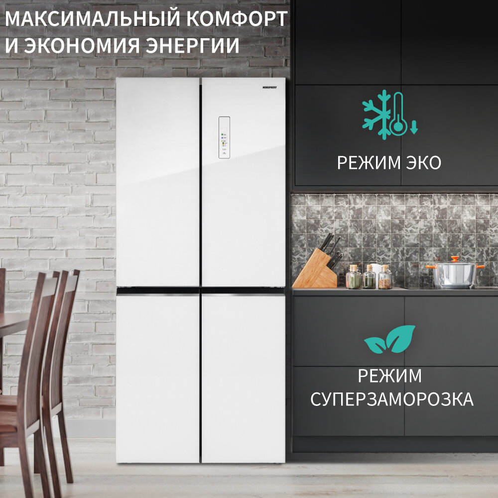 Холодильник NORDFROST RFQ 450 NFGW, 4 двери, инвертор, объём 451 л, индивидуальная зона свежести, белое мерцающее стекло