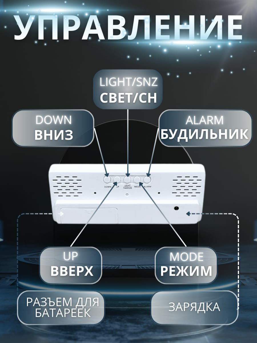Часы настольные электронные с проекцией: будильник, термометр, календарь, 19.6 х 6.5 см