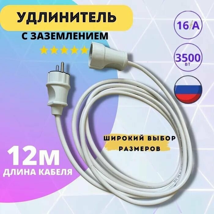 Купить Удлинитель сетевой 12м с заземлением с одной розеткой IP20 16А ПВС ГОСТ 3х1,5 удлинитель бытовой, белый