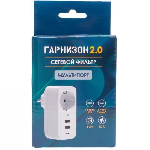 Сетевой фильтр с USB зарядкой Гарнизон 2.0 (1 розетка, 16А, 1xType-C, 2хUSB, белый)