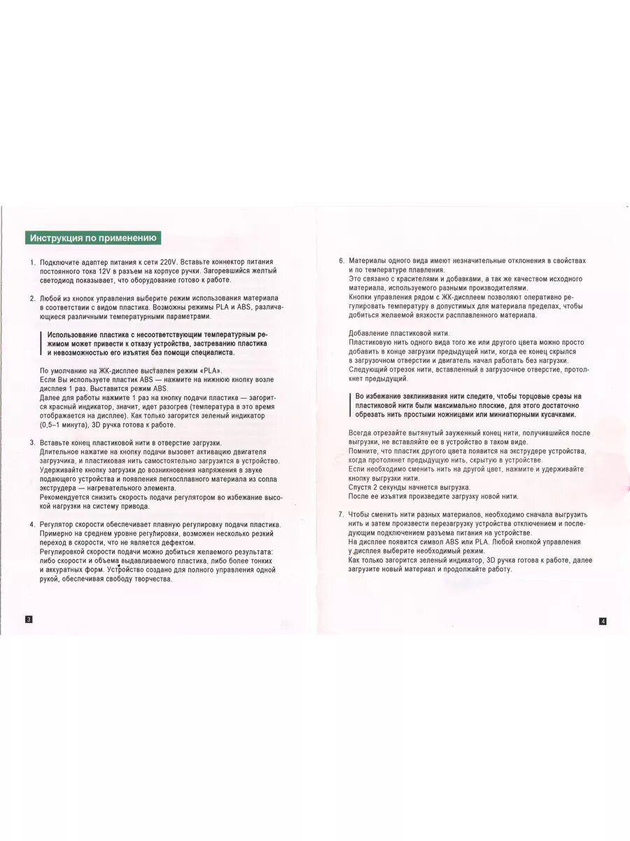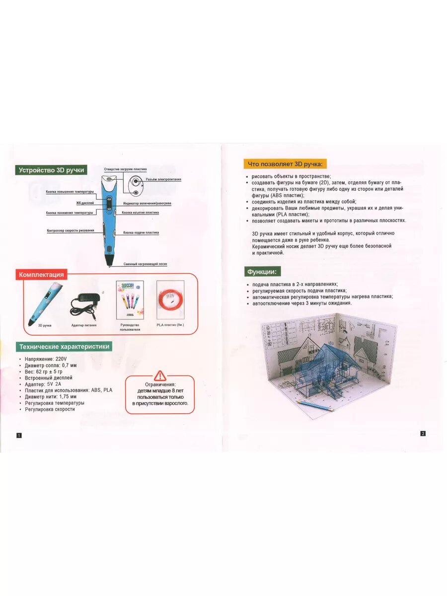 | Комплектация | 3D Ручка 1 шт, Сетевой адаптер 1 шт, Стартовый набор ABS-пластика 3 шт, Инструкция пользователя 1 шт |