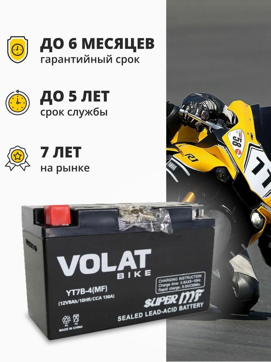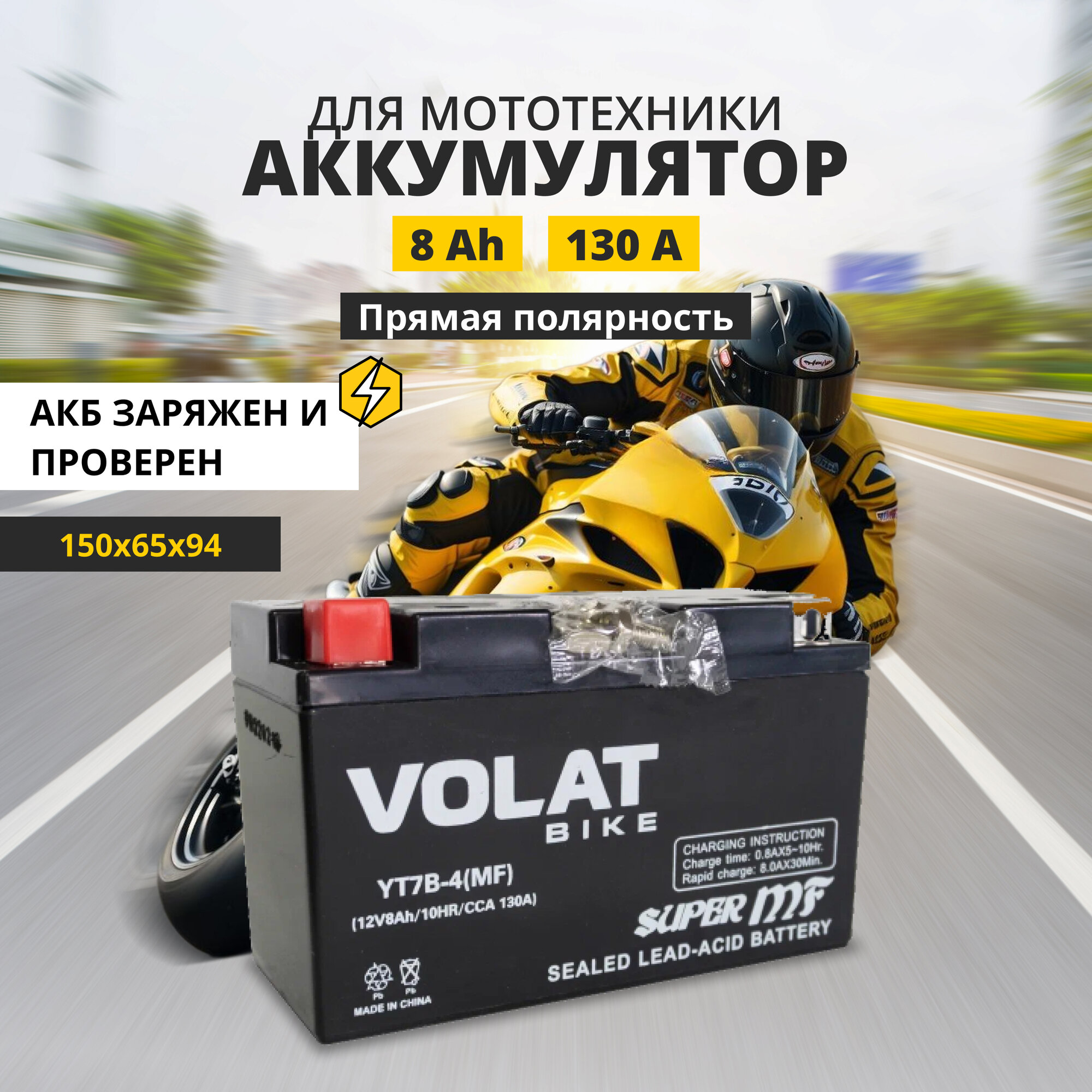 Аккумулятор для мотоцикла 12v Volat YT7B-4(MF) прямая полярность 8 Ah 130 A AGM, акб на скутер, мопед, квадроцикл 150x65x94 мм интересное: