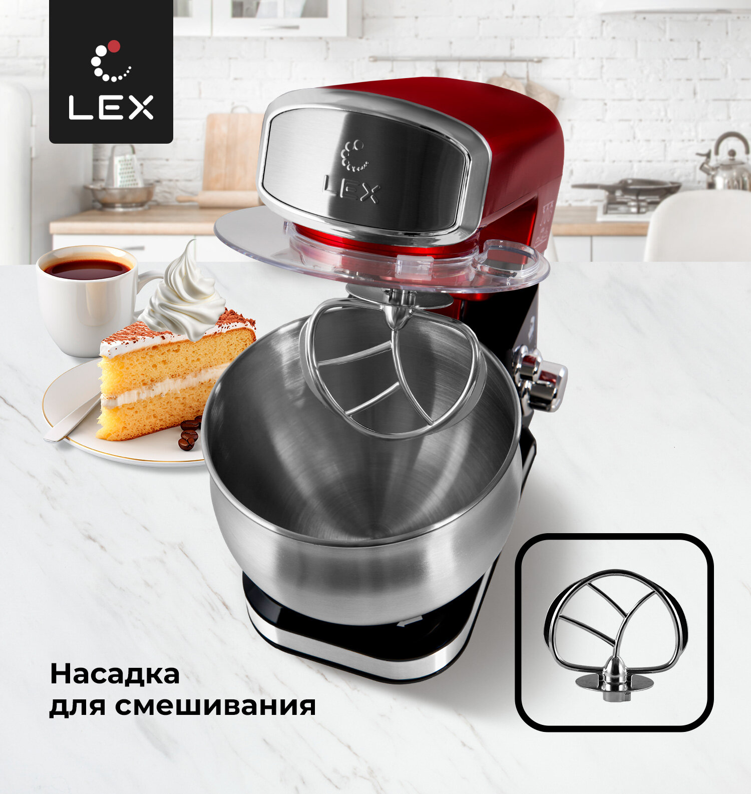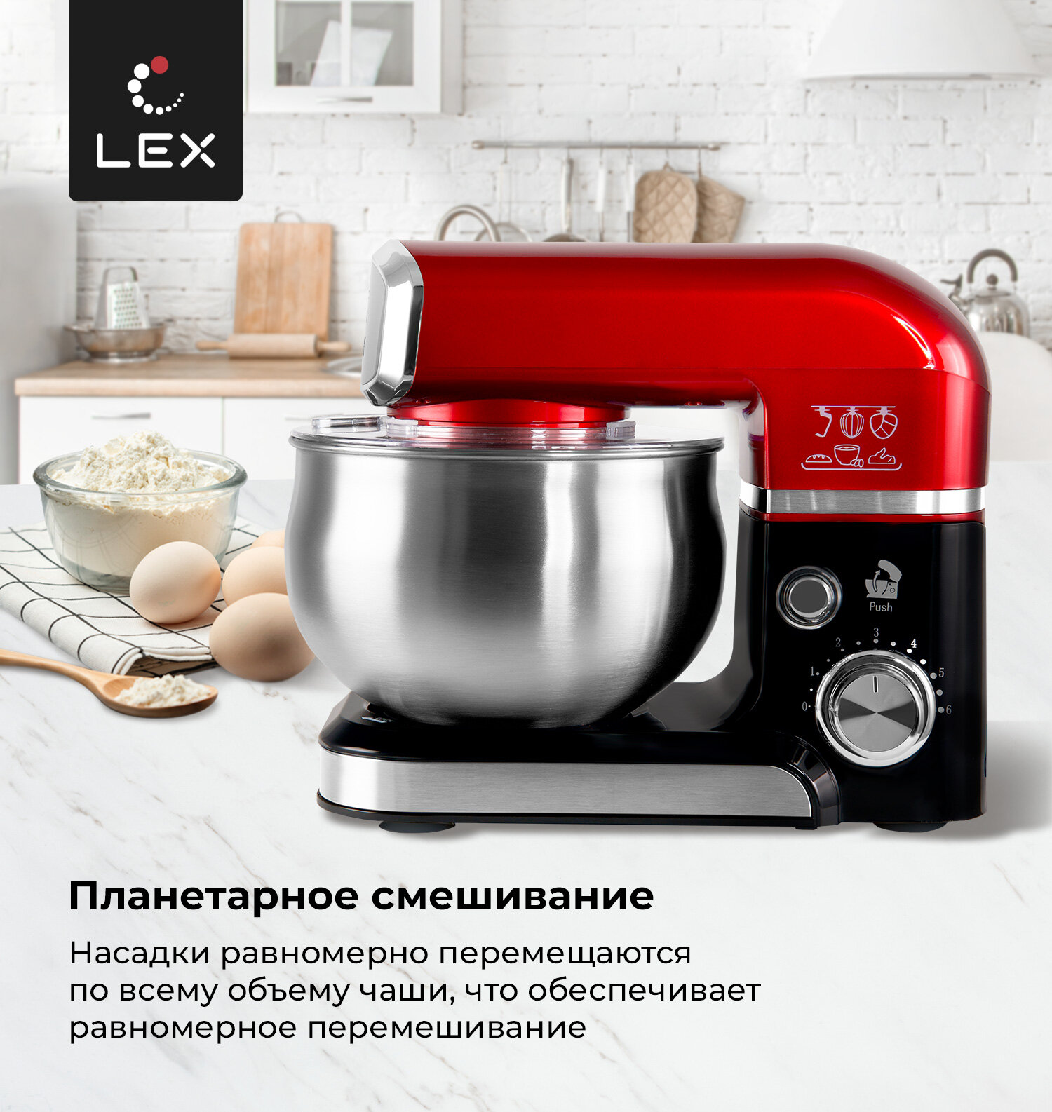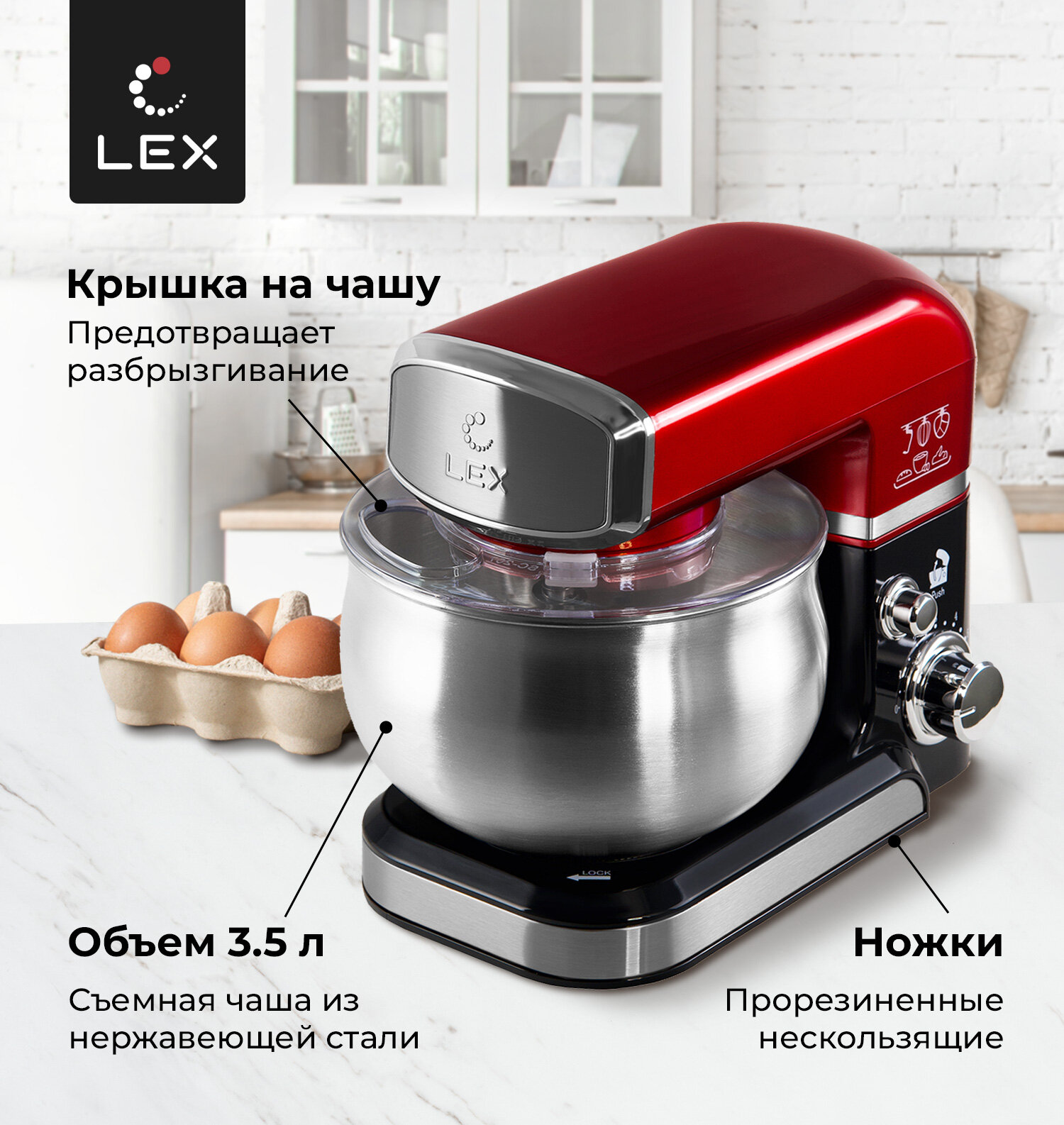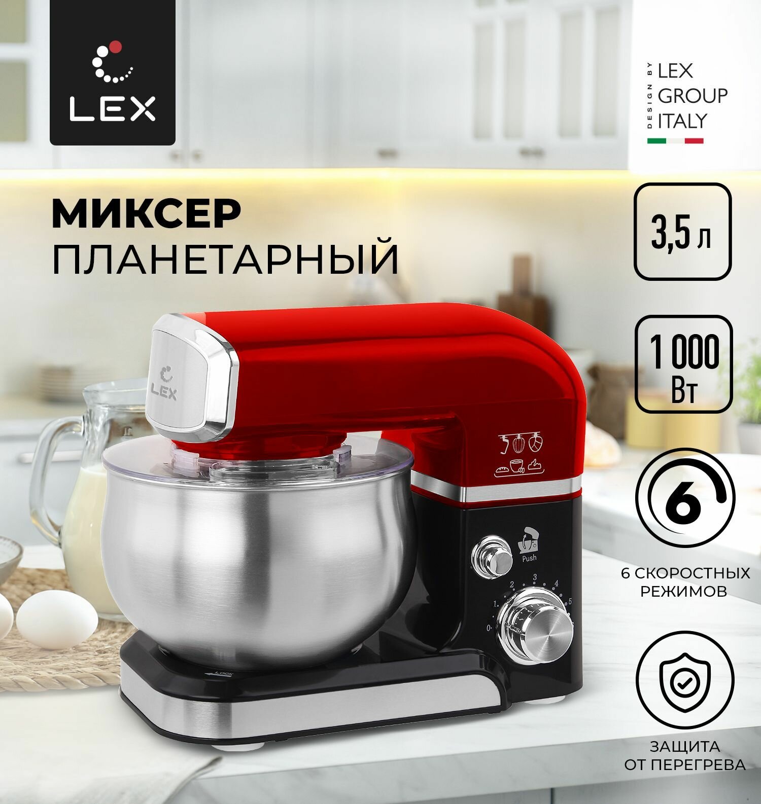 Миксер планетарный LEX LXMX 4134,Защита от перегрева, Защита от перегрузки, Прорезиненные нескользящие ножки, Объем чаши-3,5л.