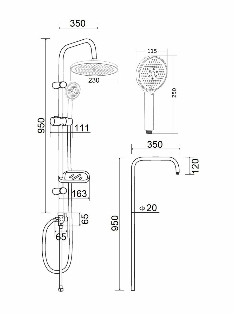 | Комплектация | верхний душ / держатель лейки / душевая штанга / кронштейн для верхнего душа / лейка / мыльница / настенный держатель / переключатель потоков / ручной душ / Смеситель / шланг |