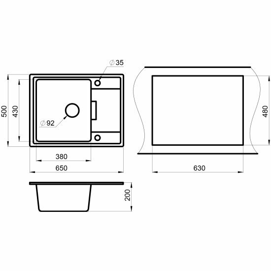 Кухонная мойка кварцевая Granula GR-6503 прямоугольная с крылом, врезная, чаша 380х430, цвет черный (6503bl)