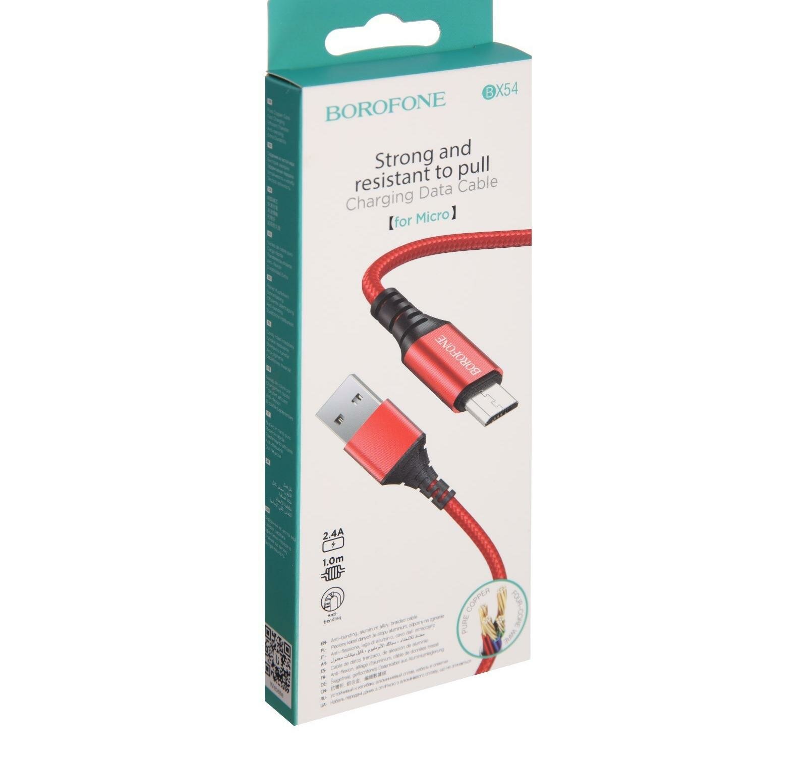 Кабель Borofone BX54, microUSB - USB, 2.4 А, 1 м, нейлоновая оплётка, красный