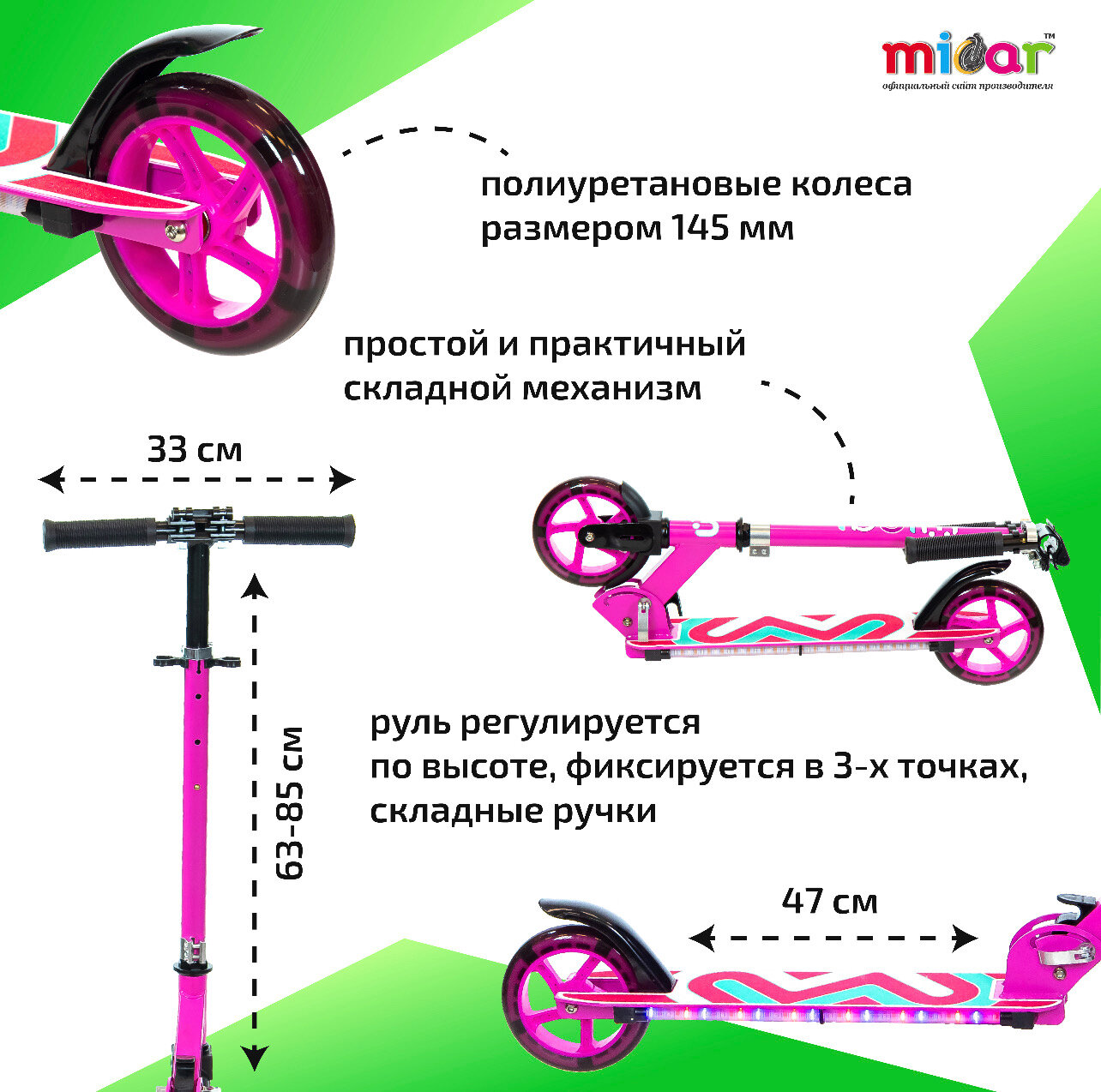 | Конструктивные особенности | крыло заднее / крыло переднее / литые колеса / регулировка высоты руля / светящиеся колеса / складной |