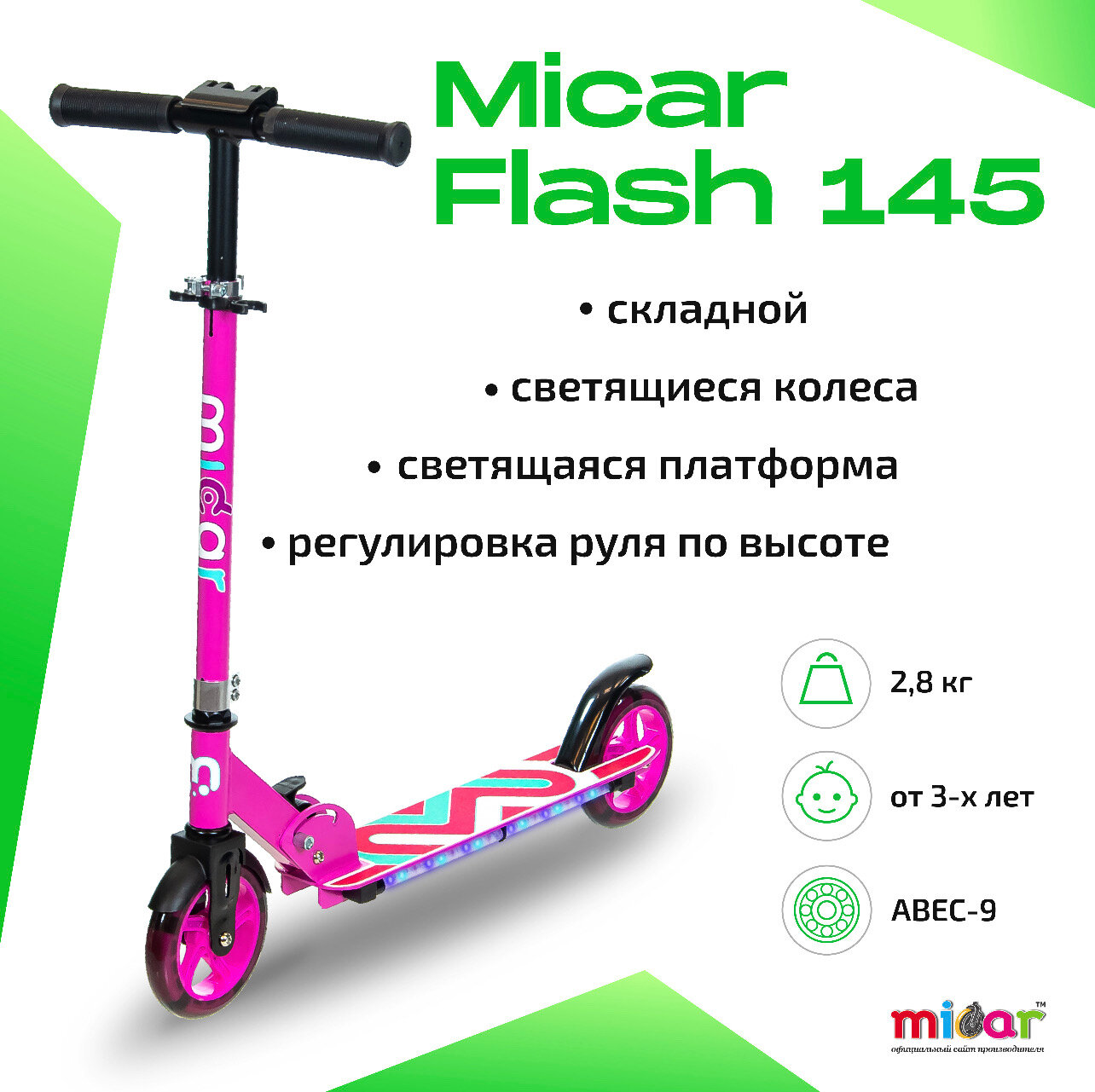 Детский двухколёсный самокат со светящимися колёсами и платформой Micar Flash 145 Розовый интересное:
