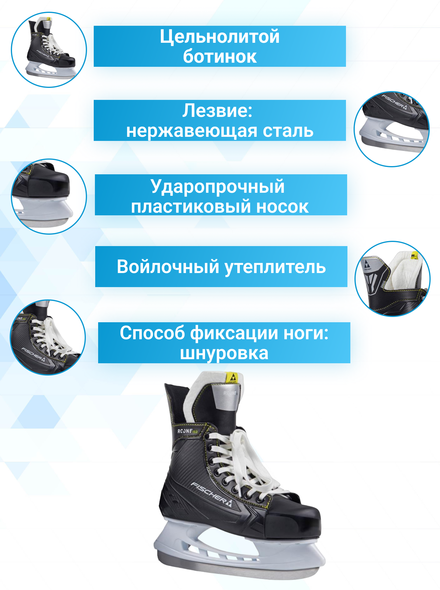 | Дополнительная информация | цельнолитой ботинок; мягкие вставки в области лодыжек; ударопрочный пластиковый носок |