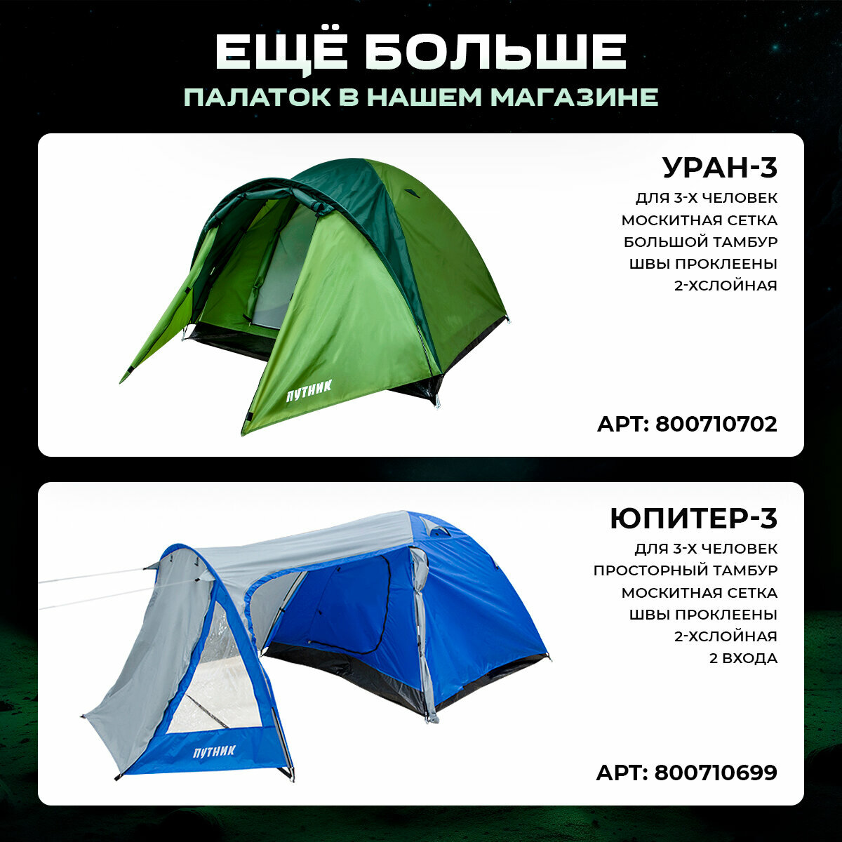 | Дополнительная информация | палатка;туристическая;шатер;трехместная; местная; 3; 4; тамбуром;тент;шатер;двухслойная;рыболовные;туризма;водонепроницаемая;кемпинговая;сетка;походные;москитная;карповая;3местная;непромокаемая;навес;туризмпоходы;быстросборная;водостойкая;антимоскитной |
