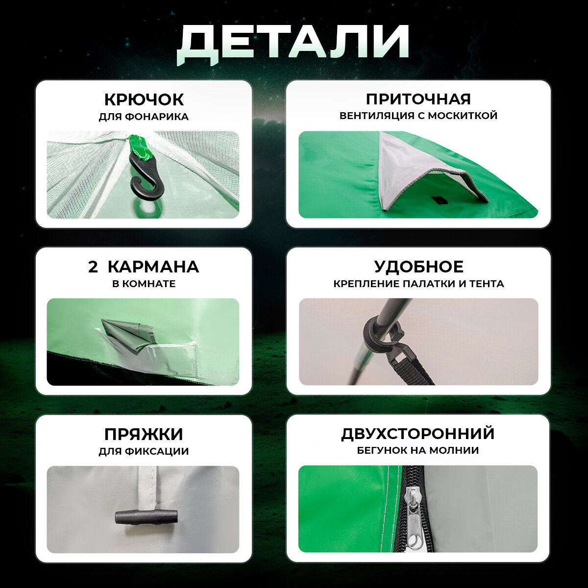 | Особенности | 1 комната / вентиляционные отверстия / ветрозащитная/снегозащитная юбка / внутренняя палатка / проклеенные швы |