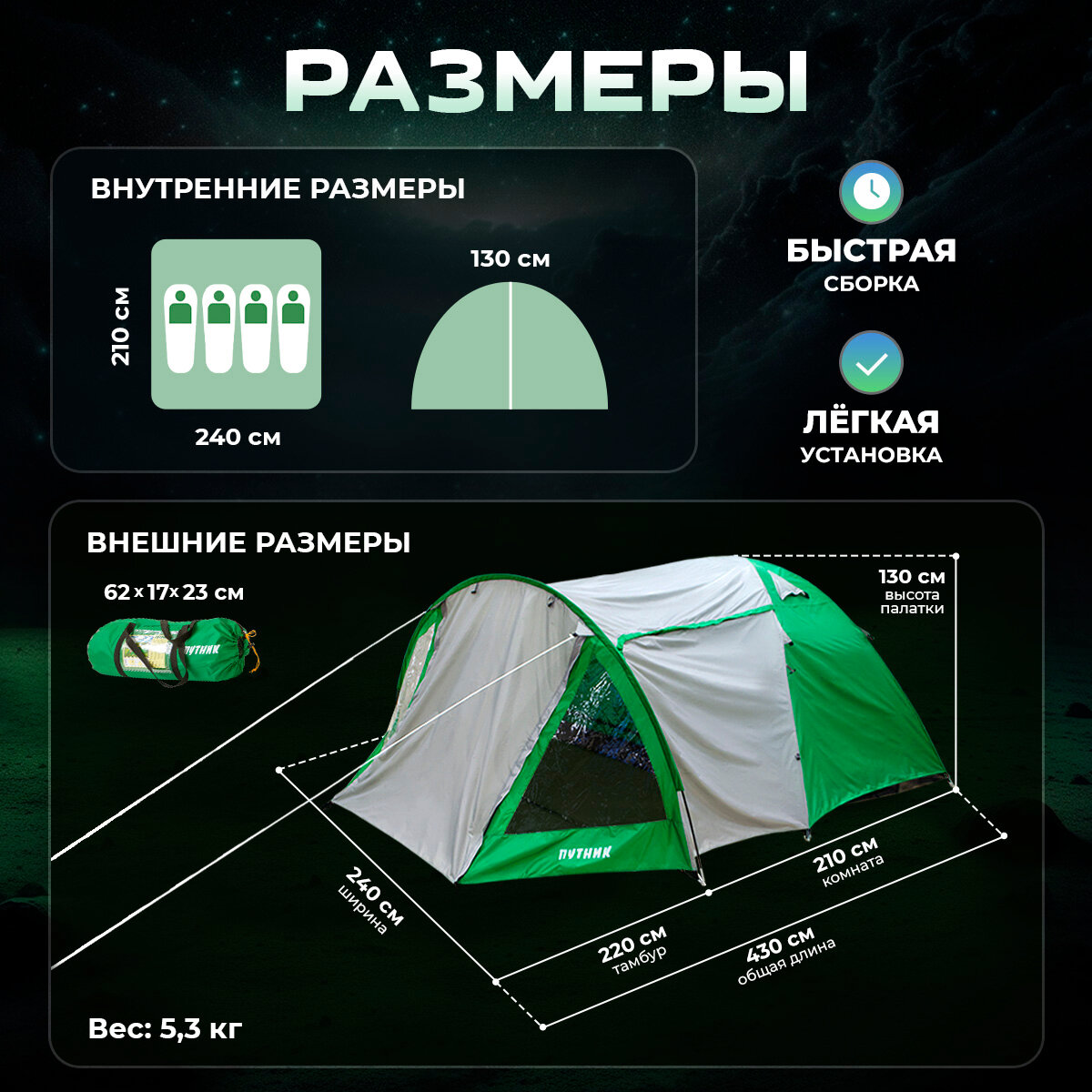 | Габариты внешней палатки(ДxШxВ) | 430x240x130 cм |