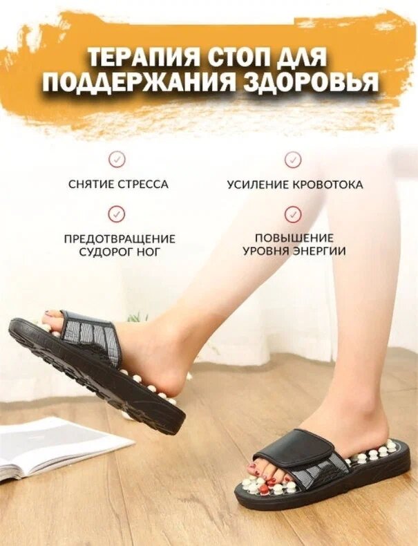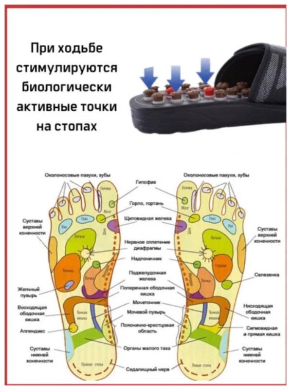 | Дополнительная информация | Специальная конструкция тапочек позволяет осуществлять динамический массаж акупунктурных точек, вырабатывать правильную осанку, поглощать ударные нагрузки на колени. |