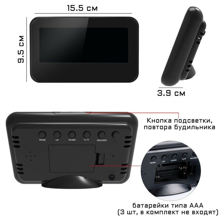 Часы электронные настольные: будильник, календарь, термометр, гигрометр, 15.5 х 9.5 см, 3ААА