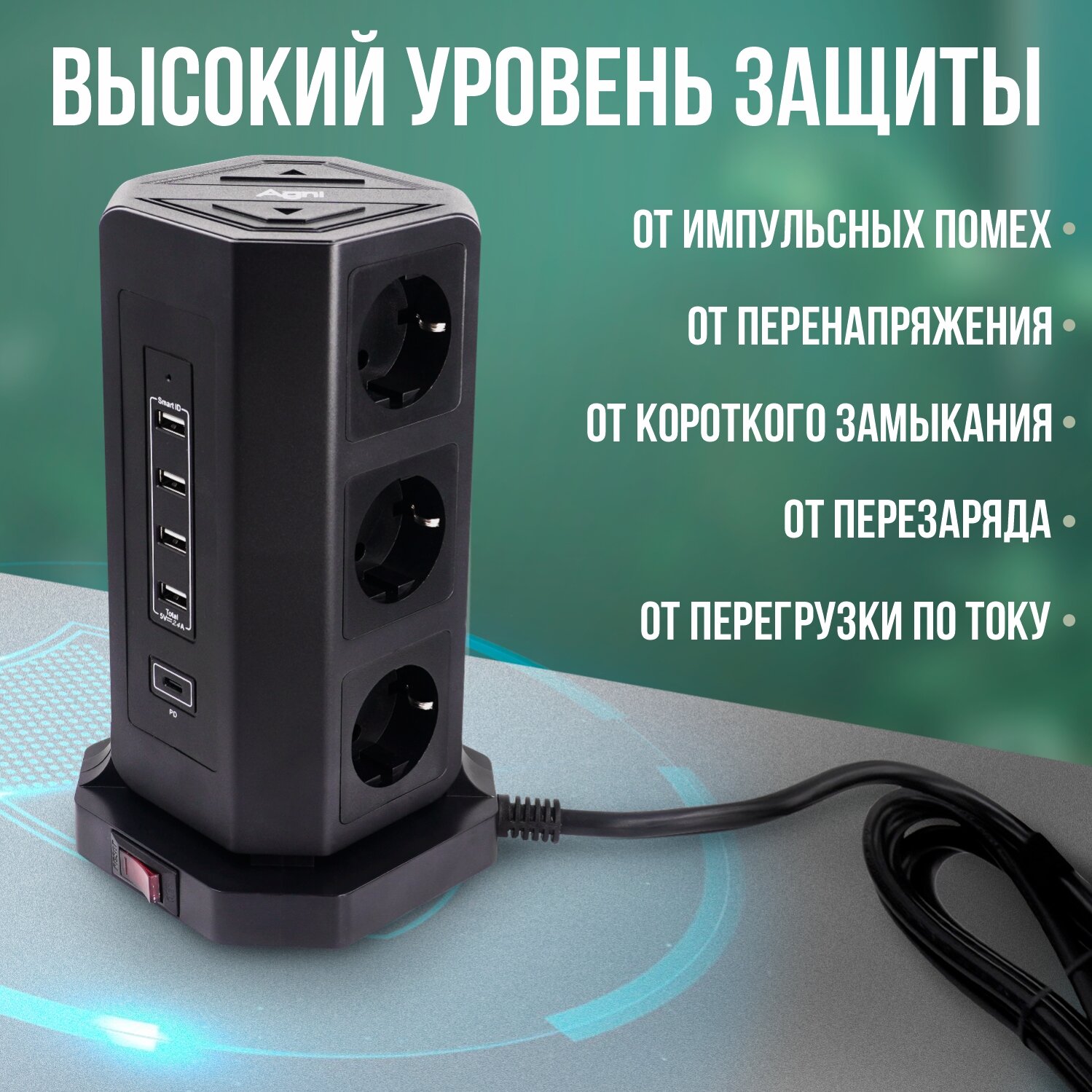 Сетевой фильтр 7 уровней защиты + супер быстрая зарядка 65W AGNI 9 розеток 220V, 4 USB 2.4A, Type-C, 2м, заземление, предохранитель 16A, 4 кВт, черный