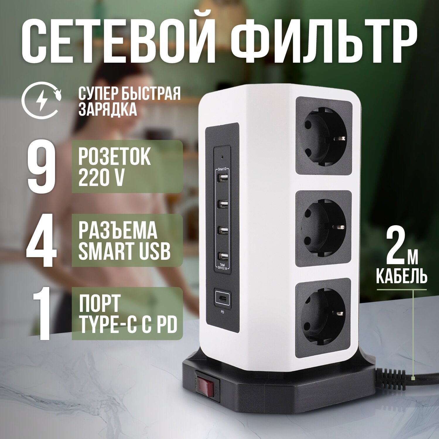 | Дополнительная информация | Мощный сетевой фильтр с smart USB разъемами |