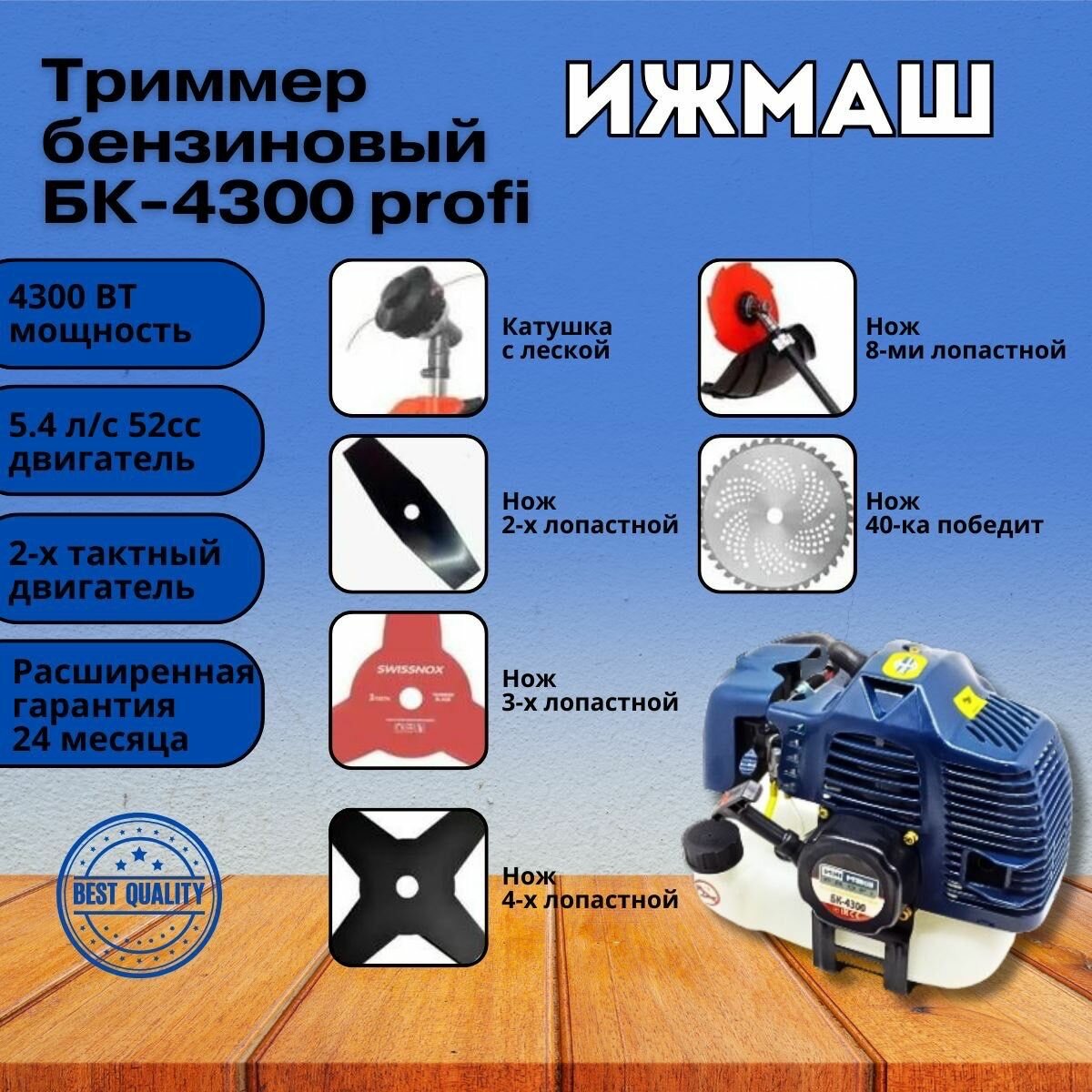 Коса бензиновая ИЖ МАШ БК-4300 (2х тактный двигатель) 52 СС, 4300Вт, 9000об/мин, 415мм Триммер, Газонокосилка