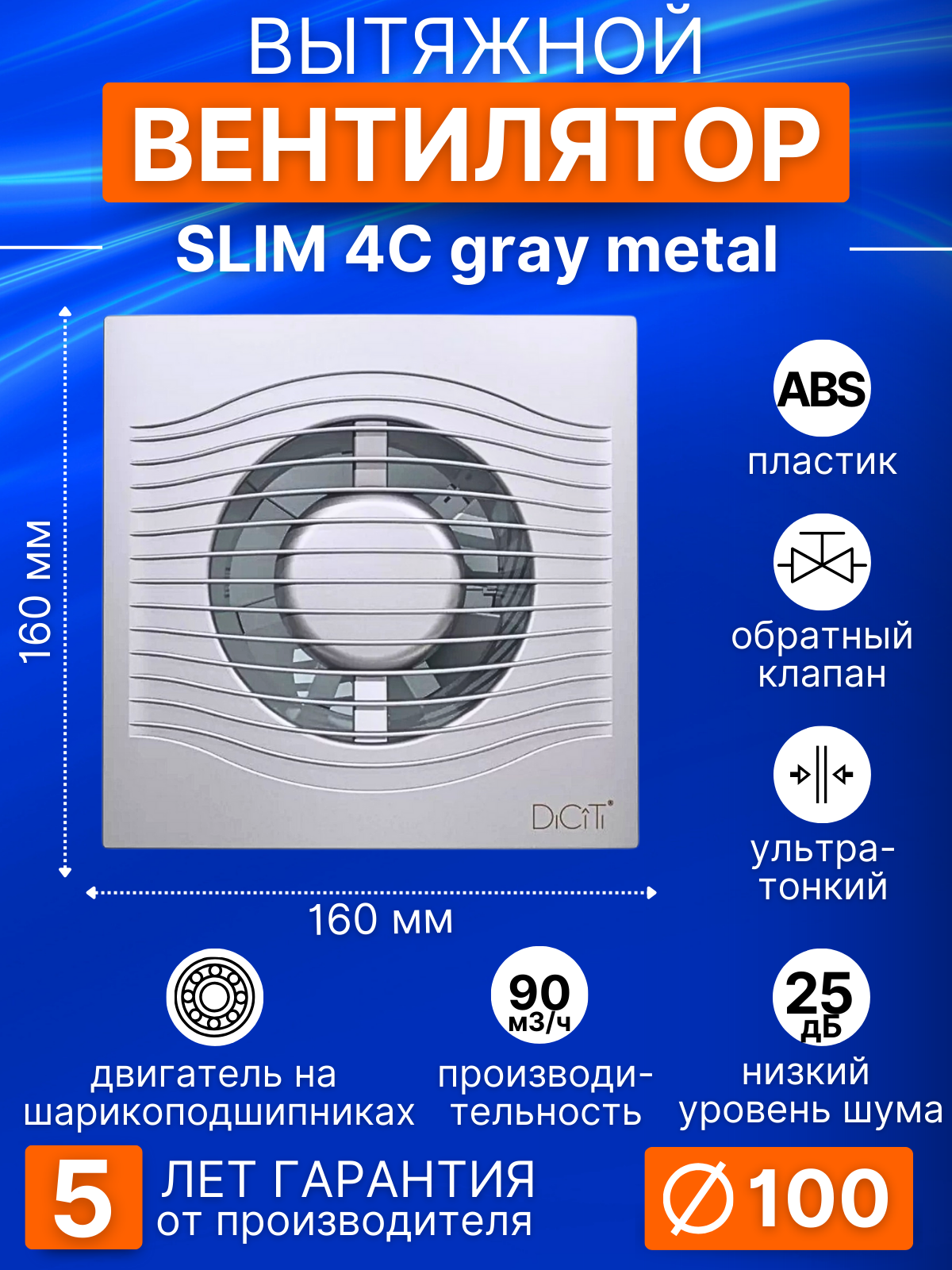 Вентилятор вытяжной DiCiTi SLIM 4C Gray metal, 100 мм, с обратным клапаном, серый металлик