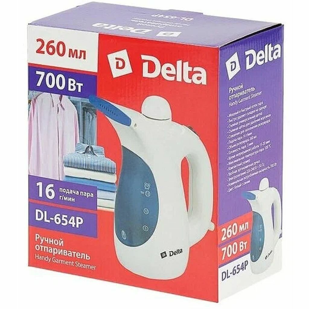 Отпариватель DELTA DL-654Р белый с синим: 700 Вт,готовность пара 3 мин.,объем резерв.-260 мл.(12)