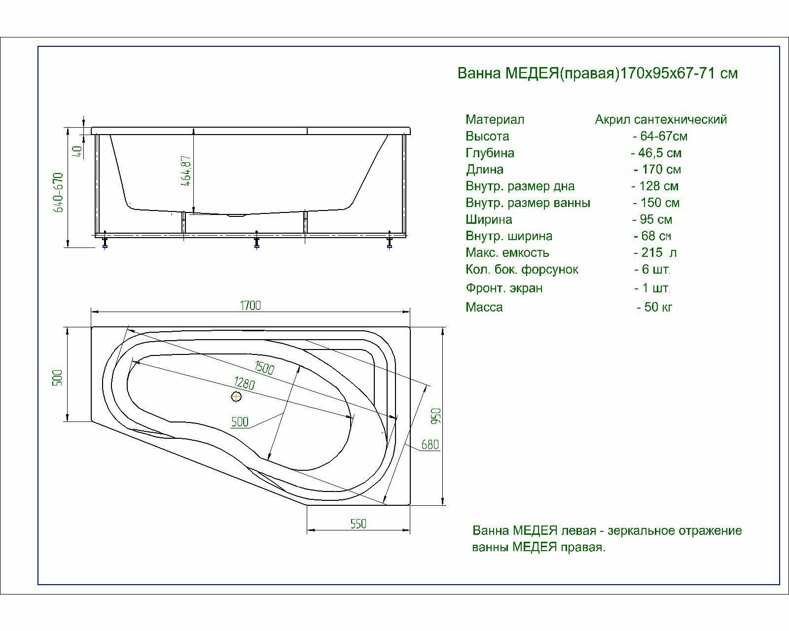 | Дополнительная информация | правосторонняя или левосторонняя; слив-перелив; опции: дезинфекция, хромотерапия, подголовник, смеситель |