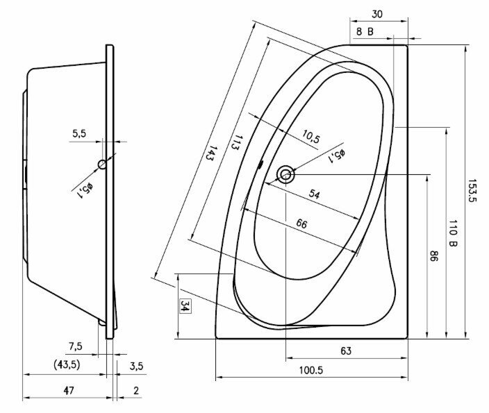 Акриловая ванна RIHO LYRA 153x100 R, B021001005 (BA6700500000000)