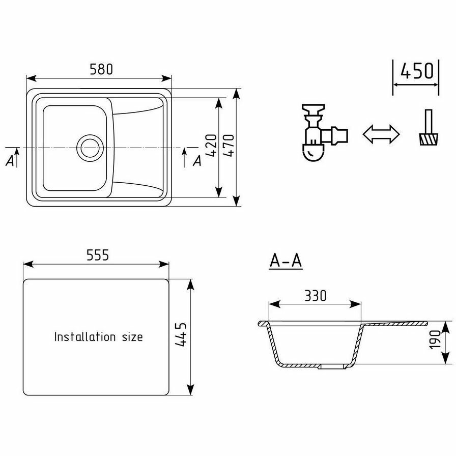 Мойка Ulgran, мрамор, U-201-308, (580*470*190 мм), черный, сифон и сливная арматура