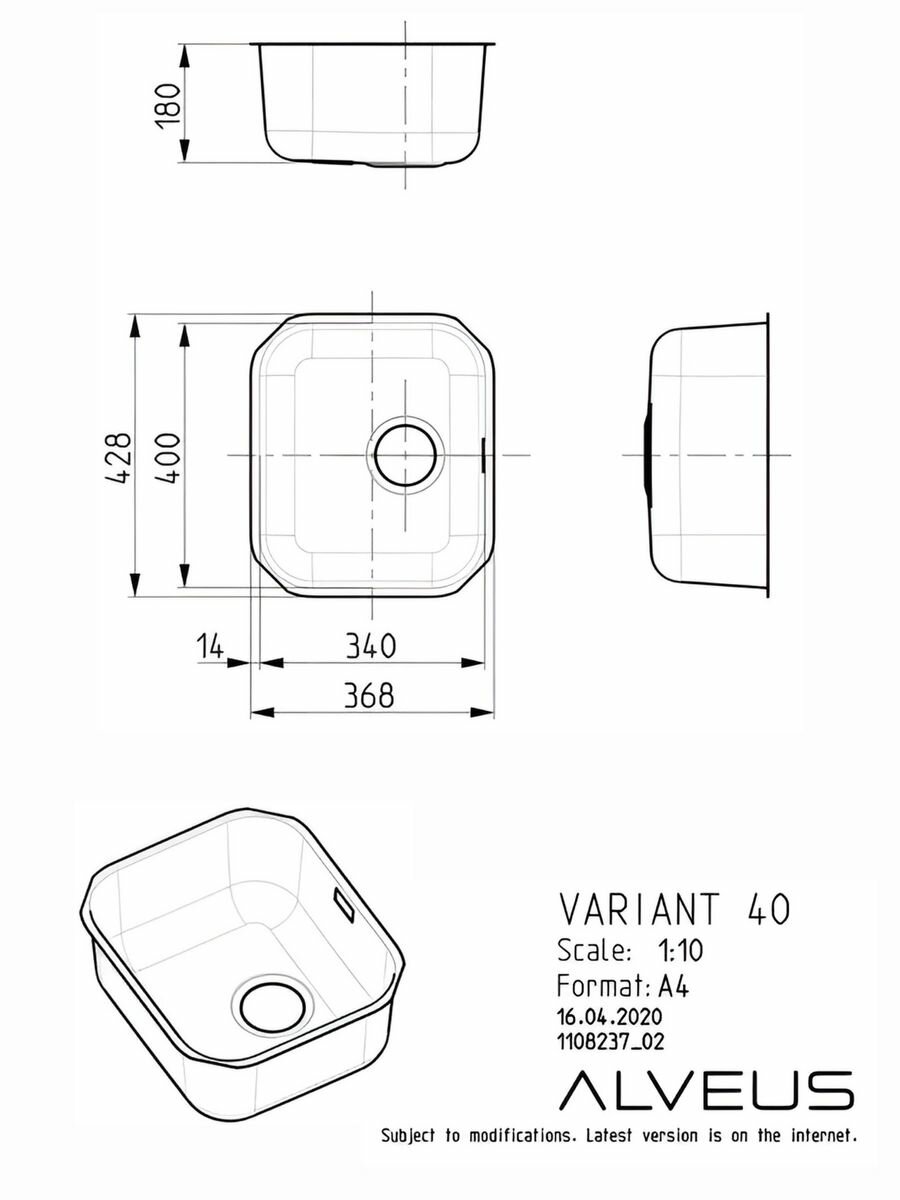 Мойка для кухни 400x340 мм, нержавеющая сталь, ALVEUS VARIANT 40 1113589