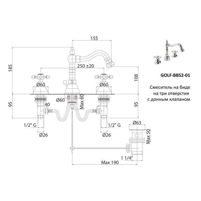 Смеситель для биде Cezares Golf на 3 отверстия, с донным клапаном (Golf-BBS2-02)