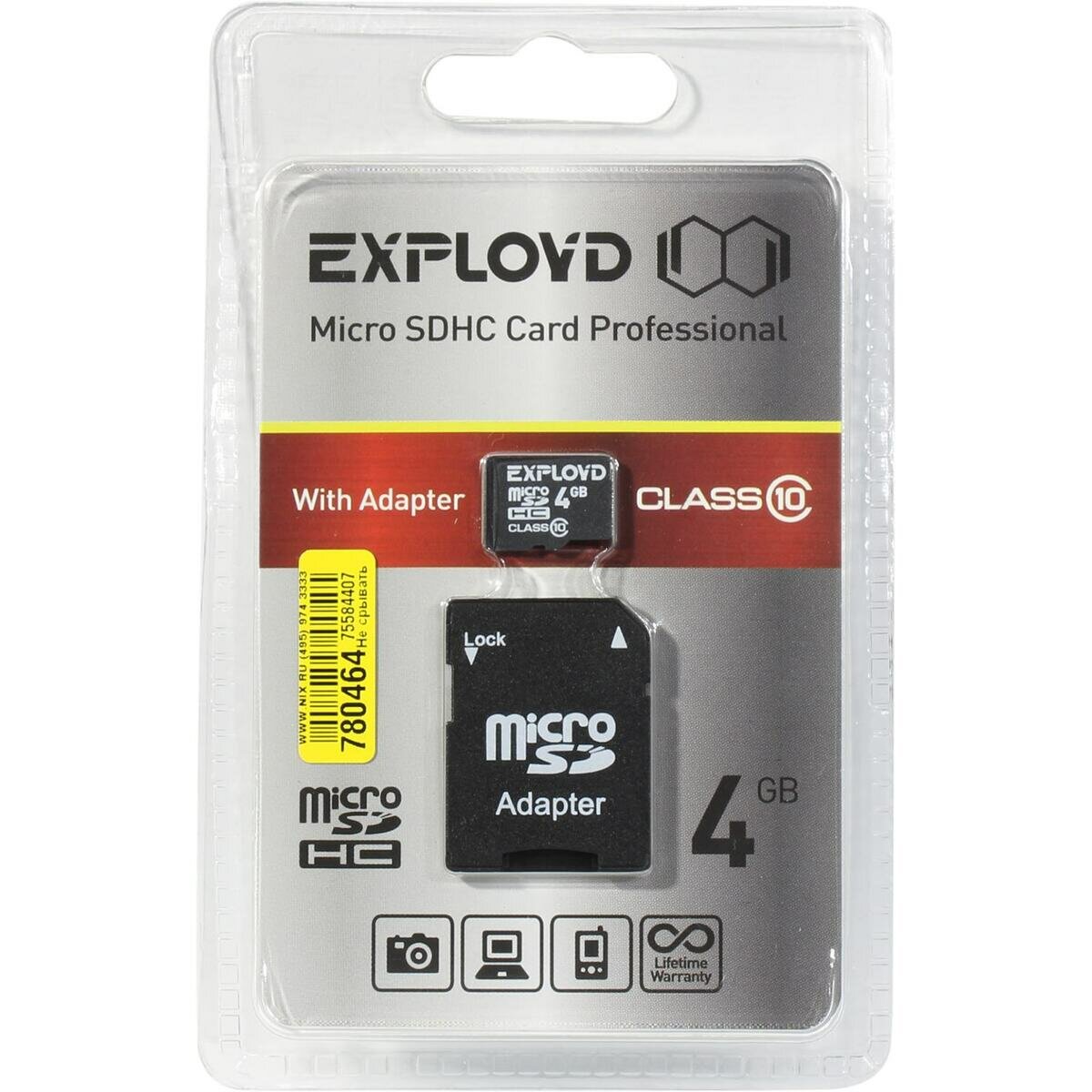 Карта памяти EXPLOYD MicroSDHC 4GB Class10 + адаптер SD, 10 MB/s, черный