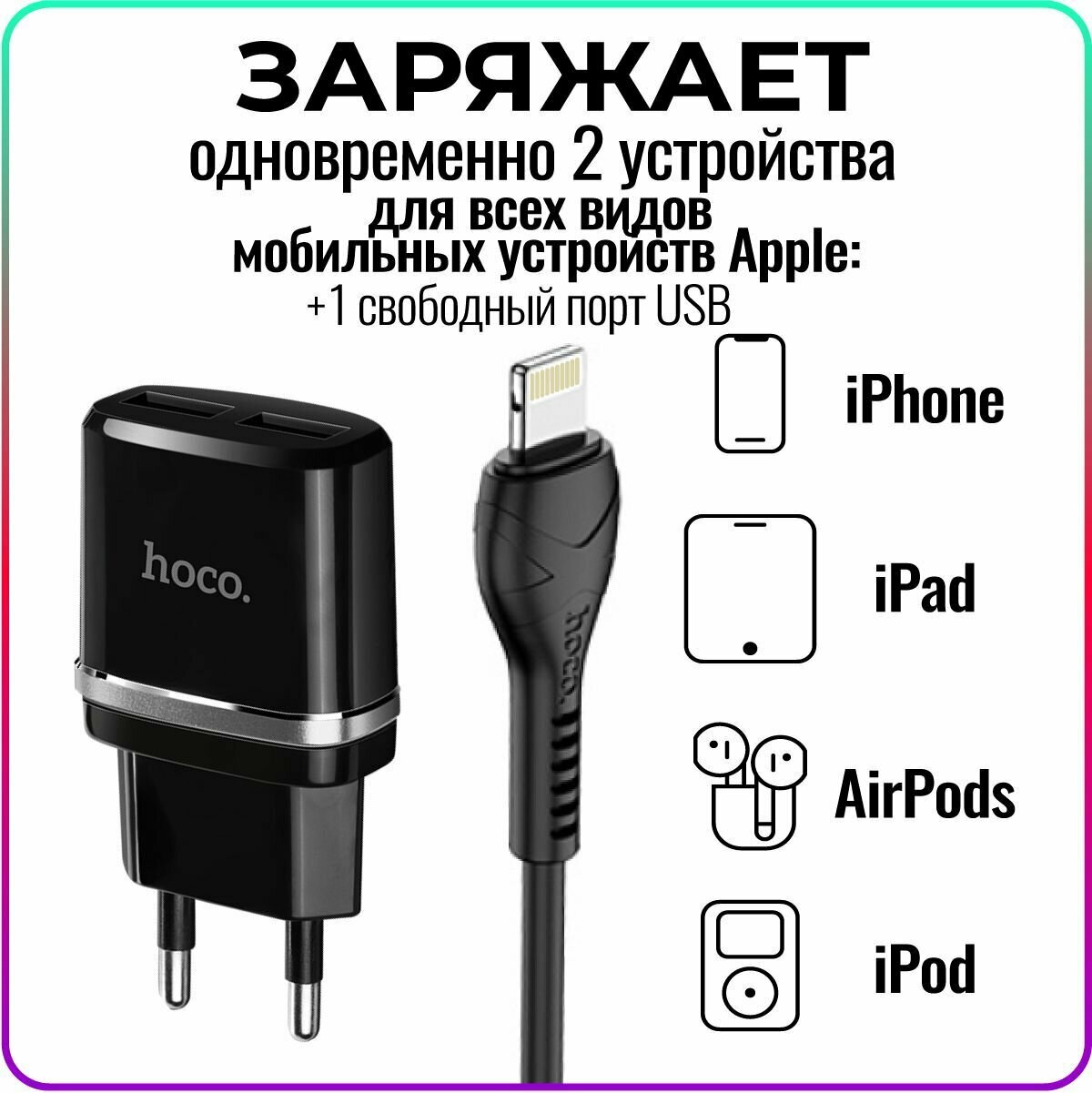 СохранитьСетевое зарядное устройство c 2 USB+кабель Lightning HOCO C12, черное, max 2.4A интересное: