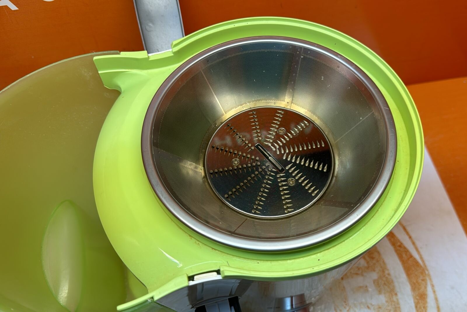 Есть контейнер для сбора жмыха, он очень упрощает мытьё соковыжималки в конце. Вижимает из всего, но цитрусовые лучше на другой. |
