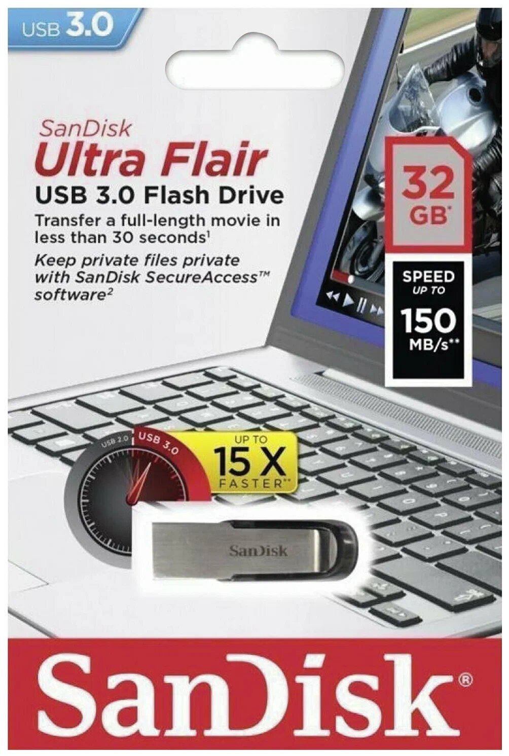Флеш-карта SanDisk Ultra Flair, 32 Гб, USB 3,0, серебристо-черная (SDCZ73-032G-G46)