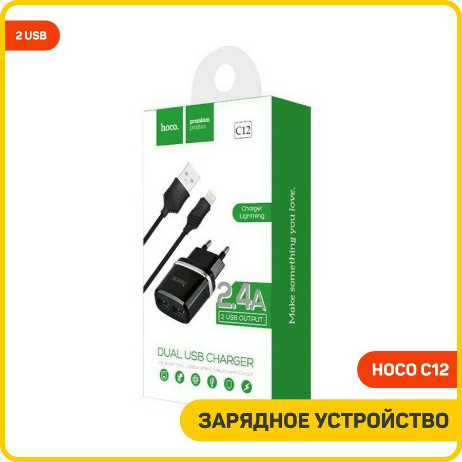 Сетевое зарядное устройство (СЗУ) Hoco C12 (2 USB) + кабель MicroUSB, 2.4 А, черный