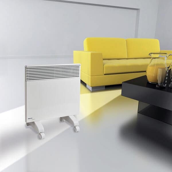 Конвектор оснащён термостатом. В комплекте есть ножки с колёсиками. Температуру работы можно регулировать вручную. Его можно вешать на стену.