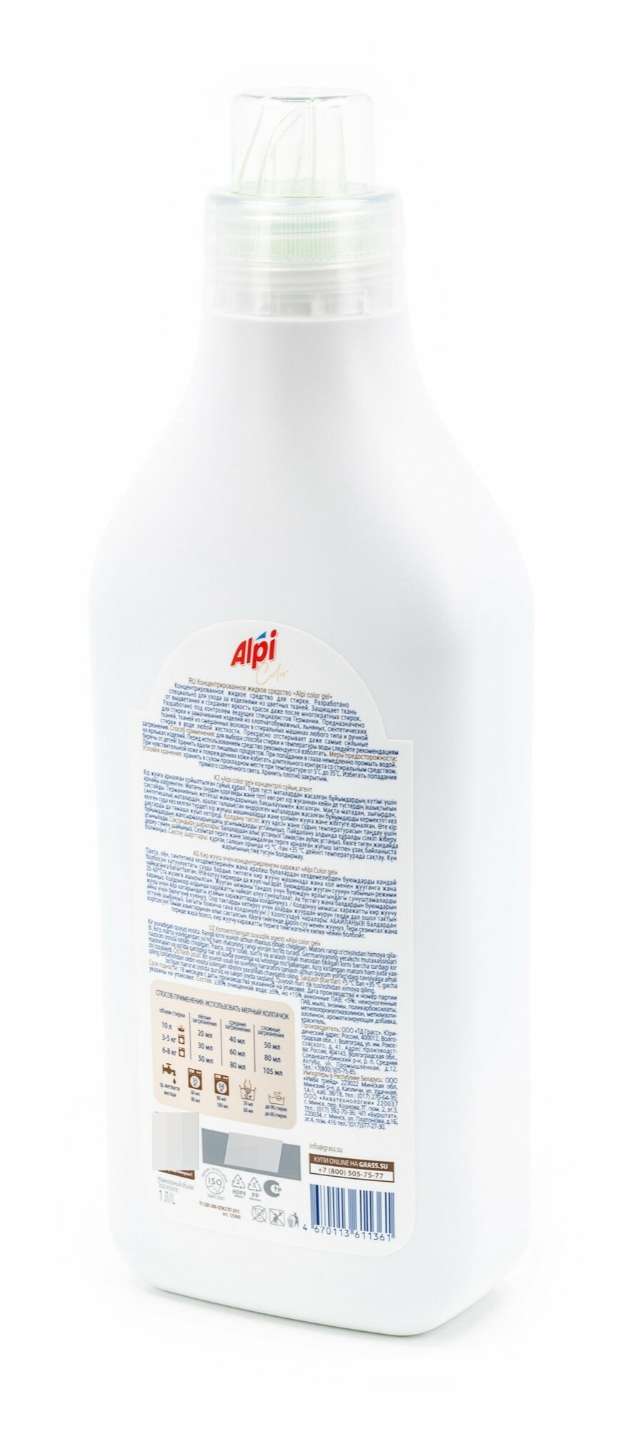 Гель для стирки белого белья Grass / Грасс Alpi White жидкий концентрат гипоаллергенный без фосфатов в бутылке с флаконом 1л